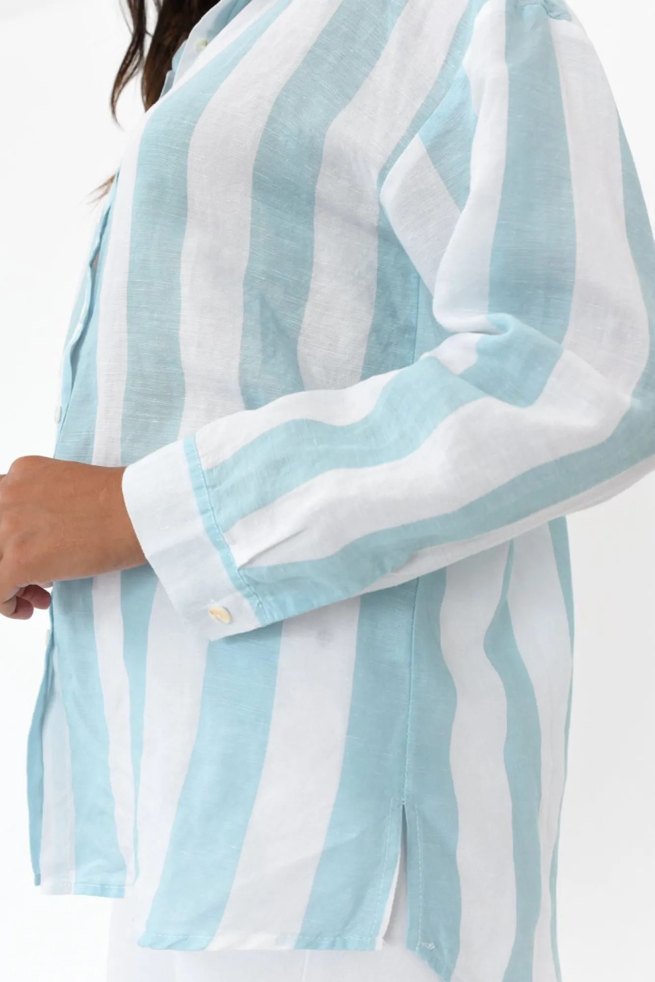 Fit: True To Size. Refer To Size & Fit Tab Below For Specific Size RecommendationNNfabric: 60% Linen, 40% Tencel Nlightweight And Breathable Linen Blend With A Textured Woven Hand FeelNclassic Button Front And Collared Neckline Shirt StyleNNfull-Length SleevesNstraight, Relaxed Silhouette Makes This A Throw On And Go StyleNhi-Lo Hem Is Straight At The Front And Curved At The BackNhip-Skimming LengthNNcare: Cool Gentle Hand Wash RecommendedNNcolour: Pastel Blue And White Stripe