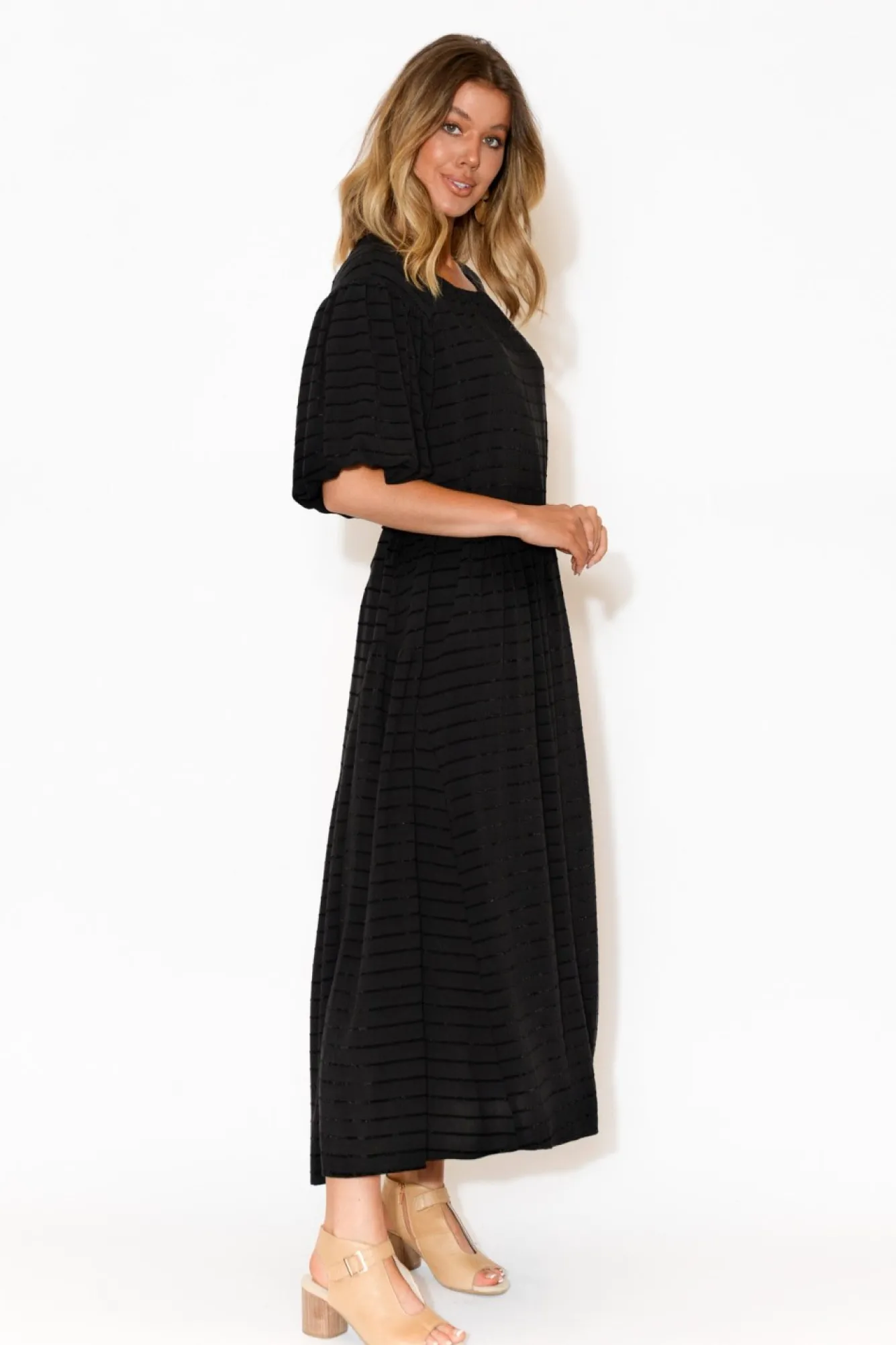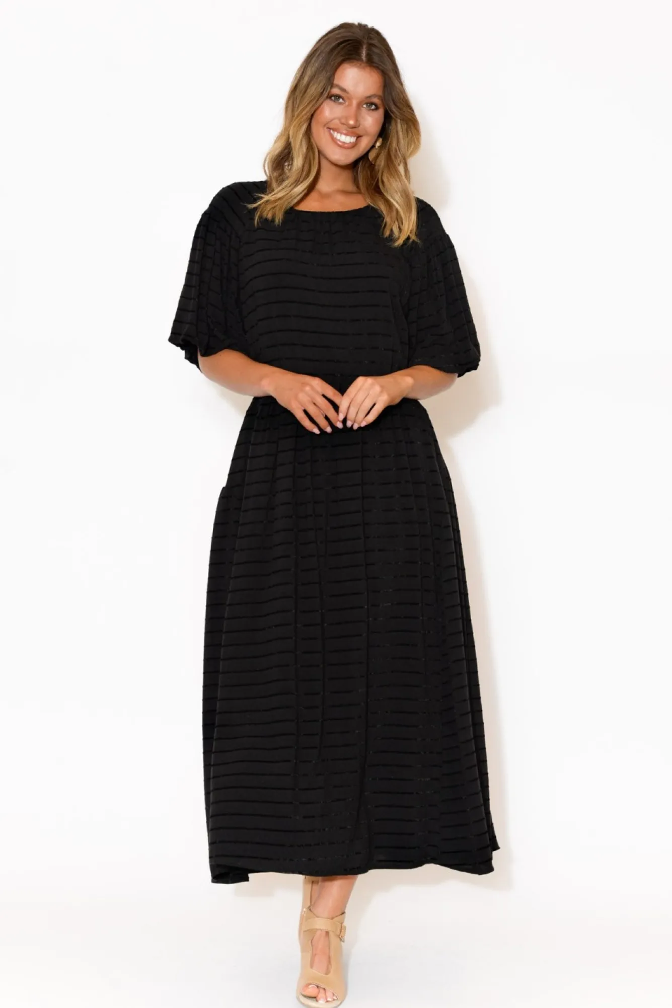 Fit: True. Refer To Size & Fit Tab Below For Specific Size Recommendation NNfabric: Main: Linen/Viscose Blend; Lining: CottonNa Flattering, Fully-Lined, Non-Stretch StyleNscoop Neckline With Keyhole Button Closure At BackNNhalf Length Balloon Sleeves Nraised Velvety-Feel Stripes Throughout Add Texture To FabricNrelaxed Fit And Flare Silhouette Created By Attached Drawstring Waist Tie With Gold Aglets Which Ties At The BackNfull Internal Non-Stretch LiningNstraight HemlineNNmaxi LengthNNcare: Cool Gentle Hand Wash RecommendedNNcolour: Timeless Black