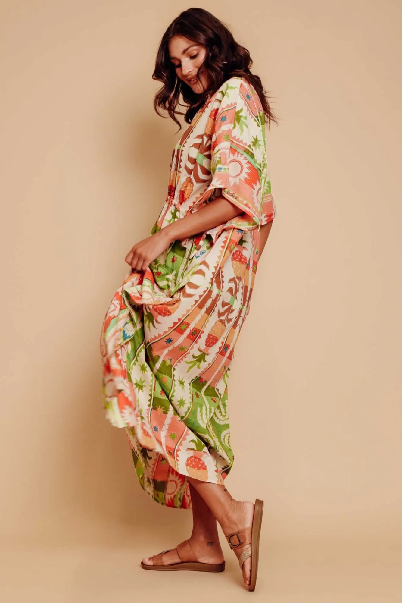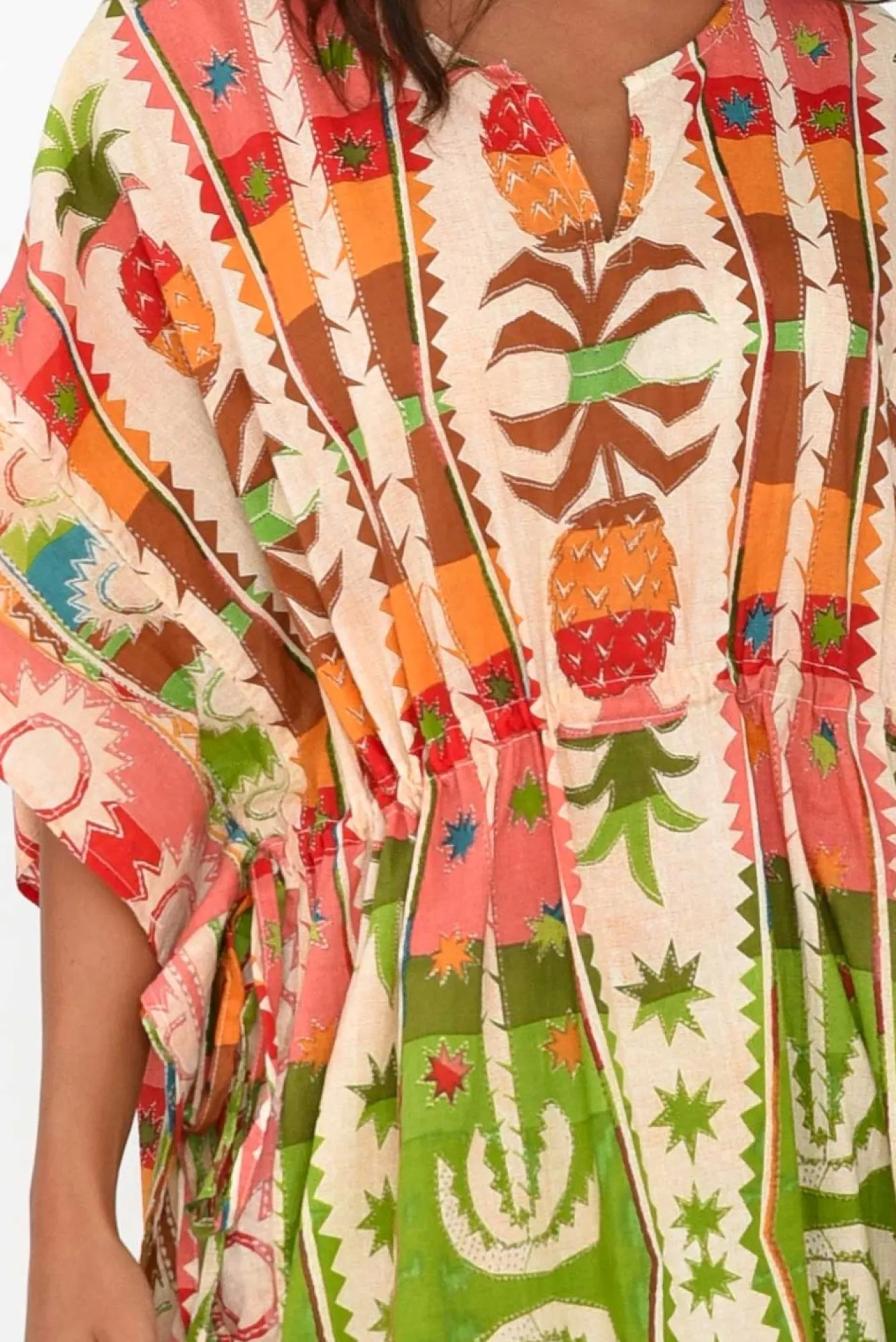 Fit: True To Size. Refer To Size & Fit Tab Below For Specific Size RecommendationNNfabric: 100% Cotton Nultra-Lightweight And Naturally Breathable Cotton With A Smooth, Crisp Hand FeelNround Neckline With A V-Split NNclassic Square-Cute, Draping Kaftan Silhouette NNhalf-Length Drape Sleeves Nsewn-In Seams That Run Up The Side Of The Body To Create A Flattering ShapeNadjustable Drawstring Runs Along The Front Of The Waist For A Ruched Effect Nfull Length Falls To The Ankles With Side Splits For Ease Of MovementNNcare: Cool Gentle Machine Wash RecommendedNNcolour: Detailed Tropical-Inspired Print With Bold Red, Green And Yellow Hues