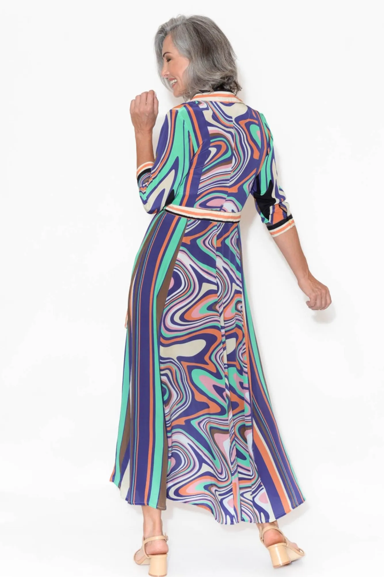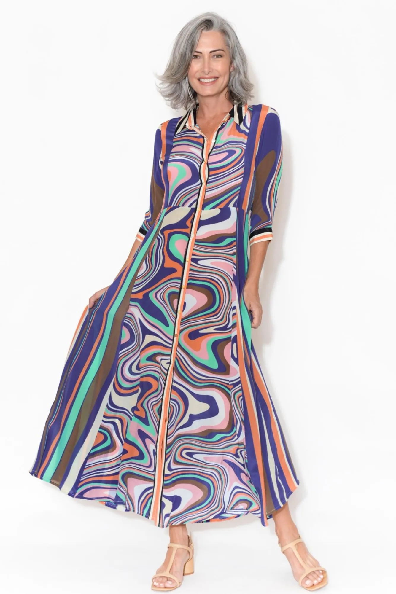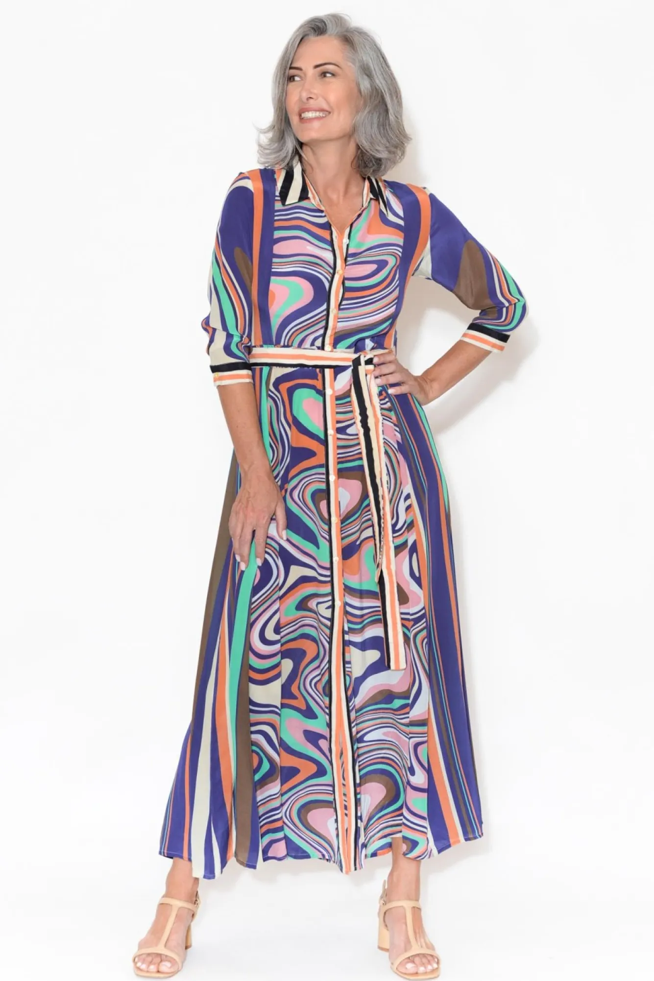 Fit: Runs Slightly Small. Refer To Size & Fit Tab Below For Specific Size Recommendation NNfabric: 100% SilkNa Stunning Non-Stretch Silk Design Perfect For Any Special Occasion!Nbutton Down Style Front With Collared NecklineNN3/4 Length Sleeves With Buttoned CuffNNfit And Flare Cut Accentuated By Waist TieNNstraight HemlineNNmaxi LengthNNNcare: Cool Gentle Machine Wash RecommendedNNcolour: Abstract Ripple Print With Hints Of Blue, Orange And GreenNNfit Tip: This Style Runs Small. If You Have A Bigger Bust, We Recommend Sizing Up For A More Comfortable Fit. Refer To The Size And Fit Tab Below To Determine The Size Best For You.