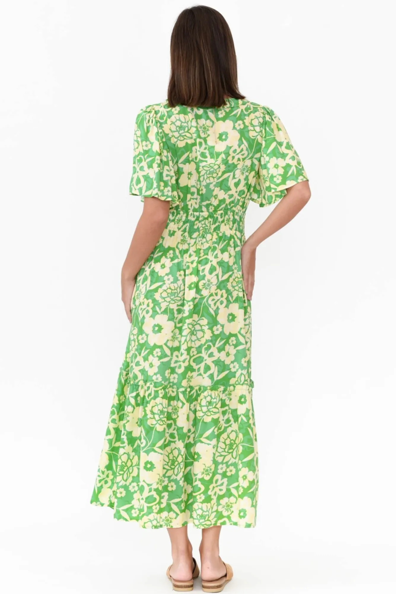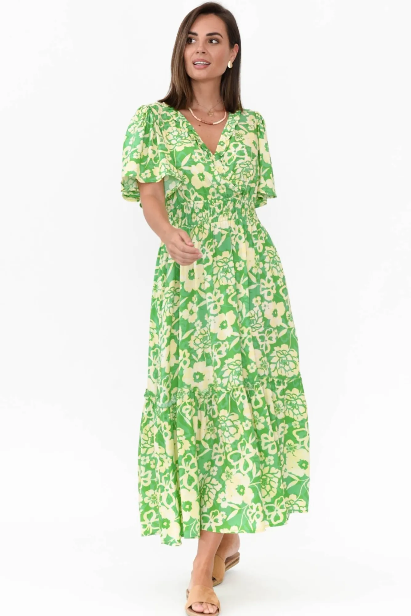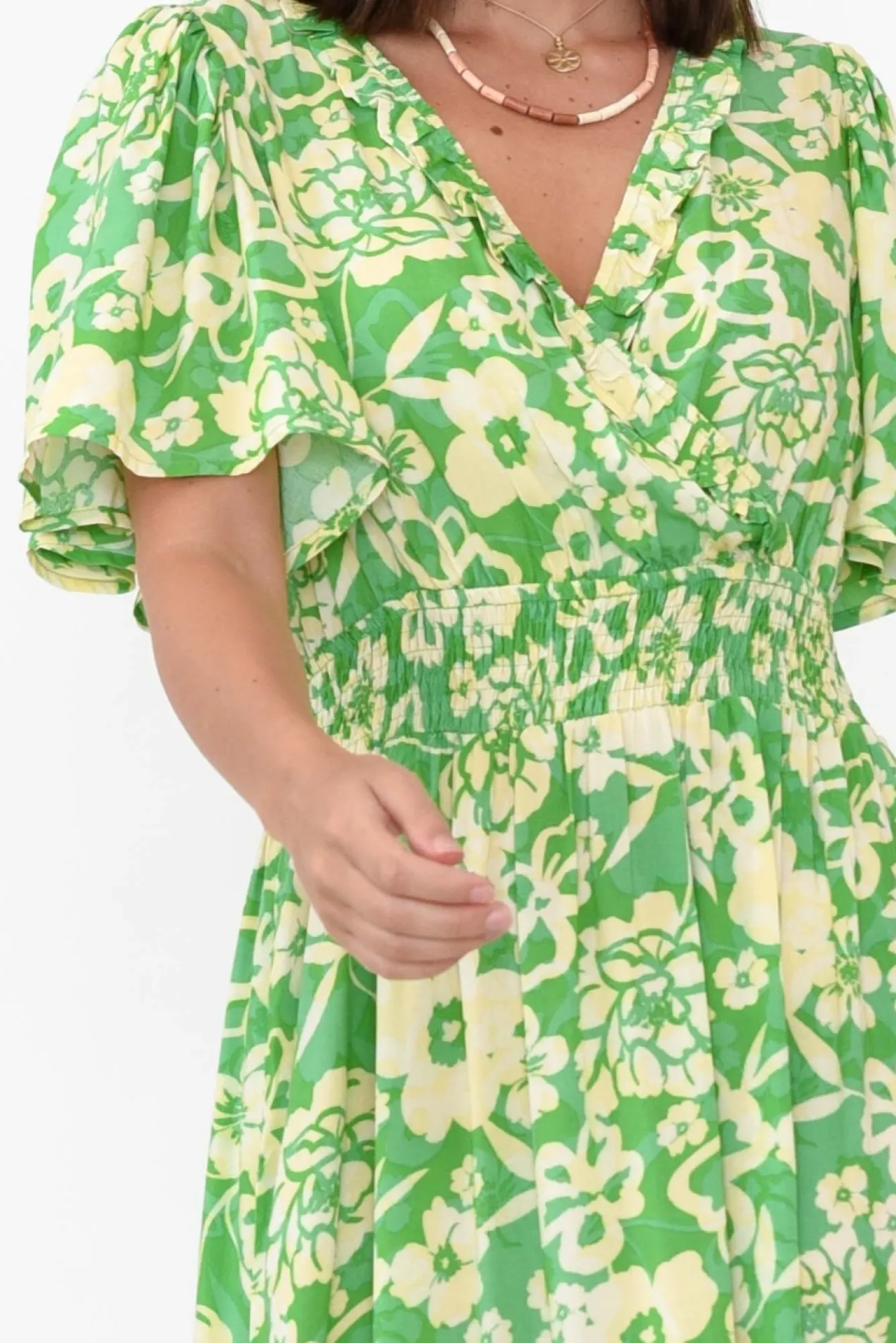 Fit: True To Size. Refer To Size & Fit Tab Below For Specific Size Recommendation NNfabric: 100% RayonNsilky Soft And Lightweight RayonNNsoft V Neckline With Frill Detailing NNfaux Wrap Over Bust With A Fixed Elastic Waistband Nmid-Length Flutter Sleeves Na-Line Silhouette With Frill Tier DesignNNtwo Hip PocketsNstraight Hem Falls To A Midi Length NNcare: Cool Gentle Machine Wash RecommendedNNcolour: Gorgeous Floral Pattern In Multiple Green Hues