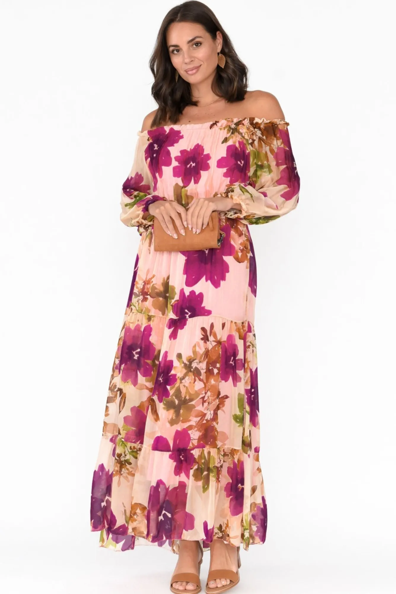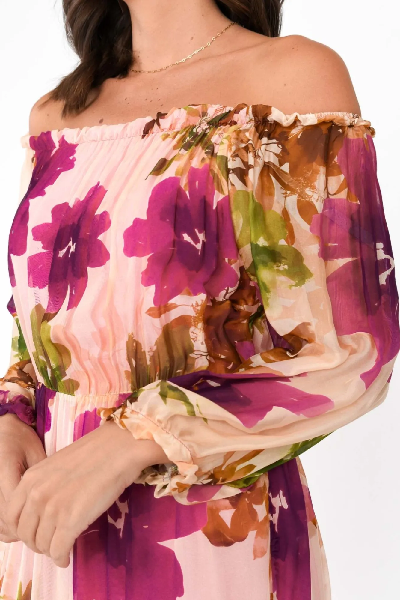 Fit: True To Size. Refer To Size & Fit Tab Below For Specific Size RecommendationNNfabric: Main: 75% Viscose, 25% Silk Lining: 95% Viscose, 5% ElastaneNNcrafted In Italy From Stunning Sheer Silk Blend Fabric With An Ultra-Comfortable And Stretchy Hot Pink Lining NNelegant Off-Shoulder NecklineNsheer Full-Length Sleeves With Elastic Cuffs NNcinched Elastic Waistline Creates ShapeNfeminine A-Line Silhouette With Tiered Detailing On The Skirt NNstraight Hem Falls To A Maxi Length NNNcare: Cool Gentle Hand Wash RecommendedNNcolour: Taupe Base With A Stunning Pink Floral Overlay