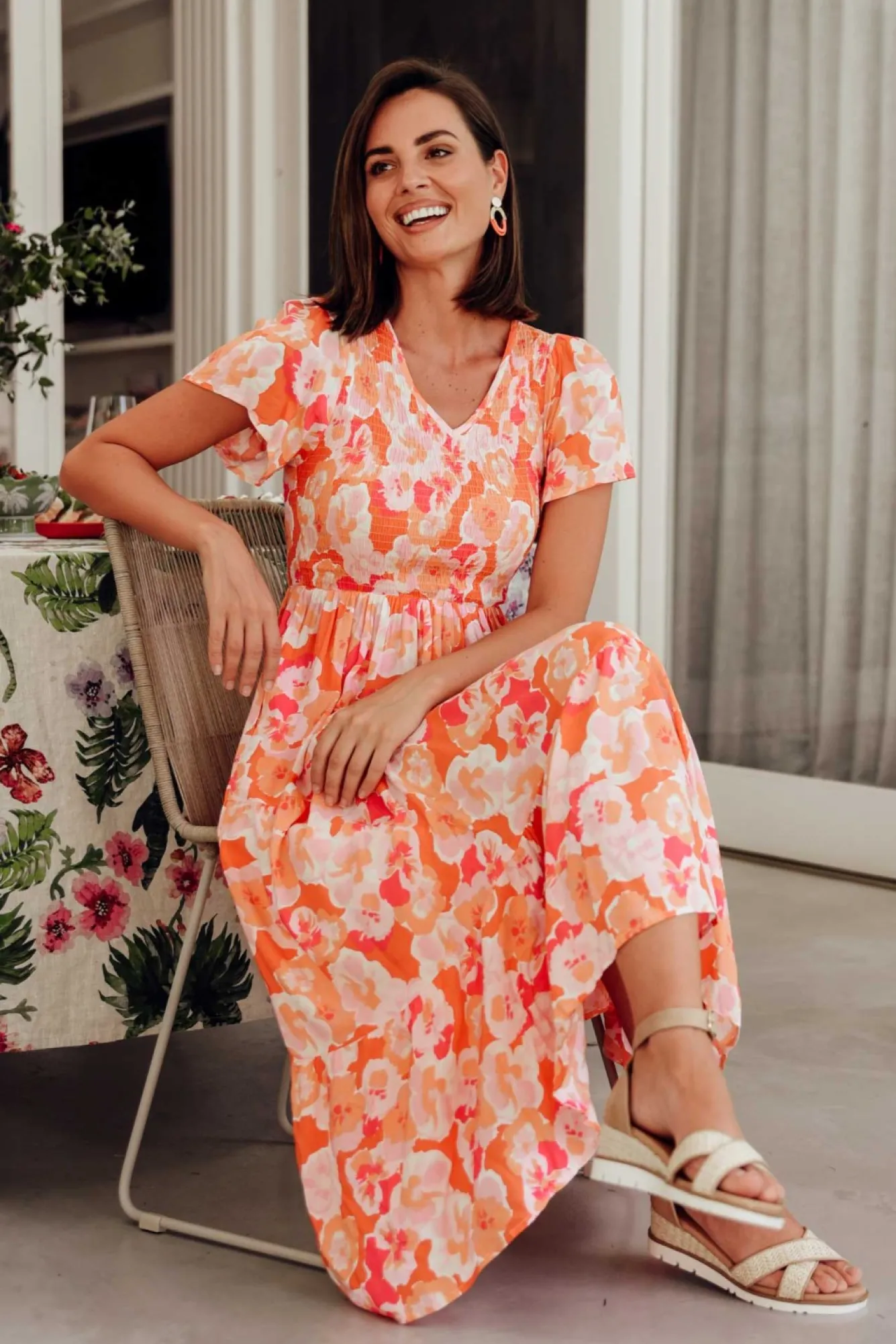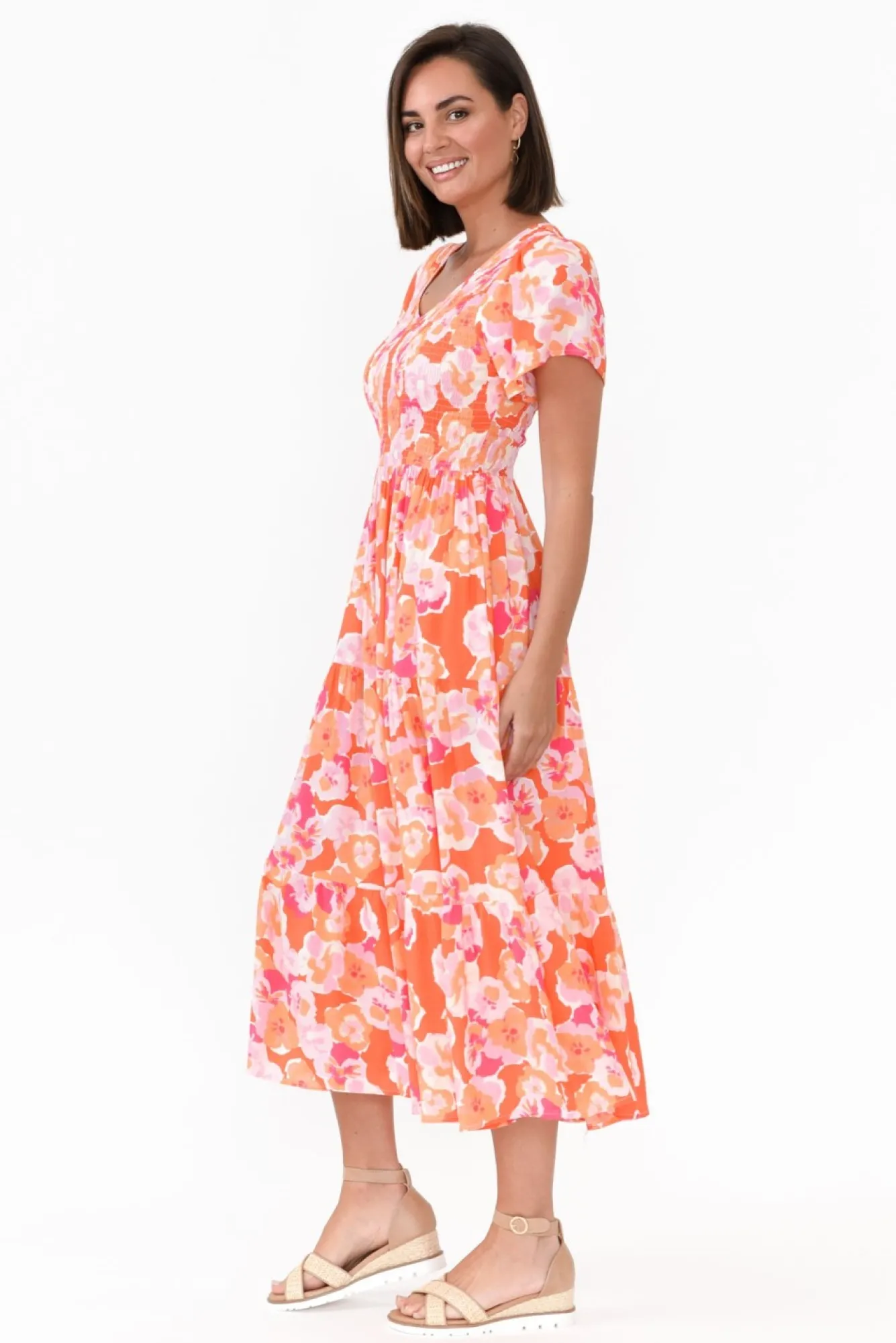 Fit: True To Size. Refer To Size & Fit Tab Below For Specific Size Recommendation NN Fabric: 100% Rayon FabricNperfectly Lightweight And Breathable Fabric, Soft To TouchNshirred Bodice Flatters Bust While Providing Contrast Between The Torso And Lower BodyNsharp V-Neckline NNshort Flutter Sleeves Offer Shoulder Coverage NN3-Tiered, A-Line Silhouette Flows Over HipsNtwo Hip PocketsNNmidi Length With A Straight HemlineNNcare: Cool Gentle Hand Wash RecommendedNNcolour: Stunning Orange And Pink Floral Design