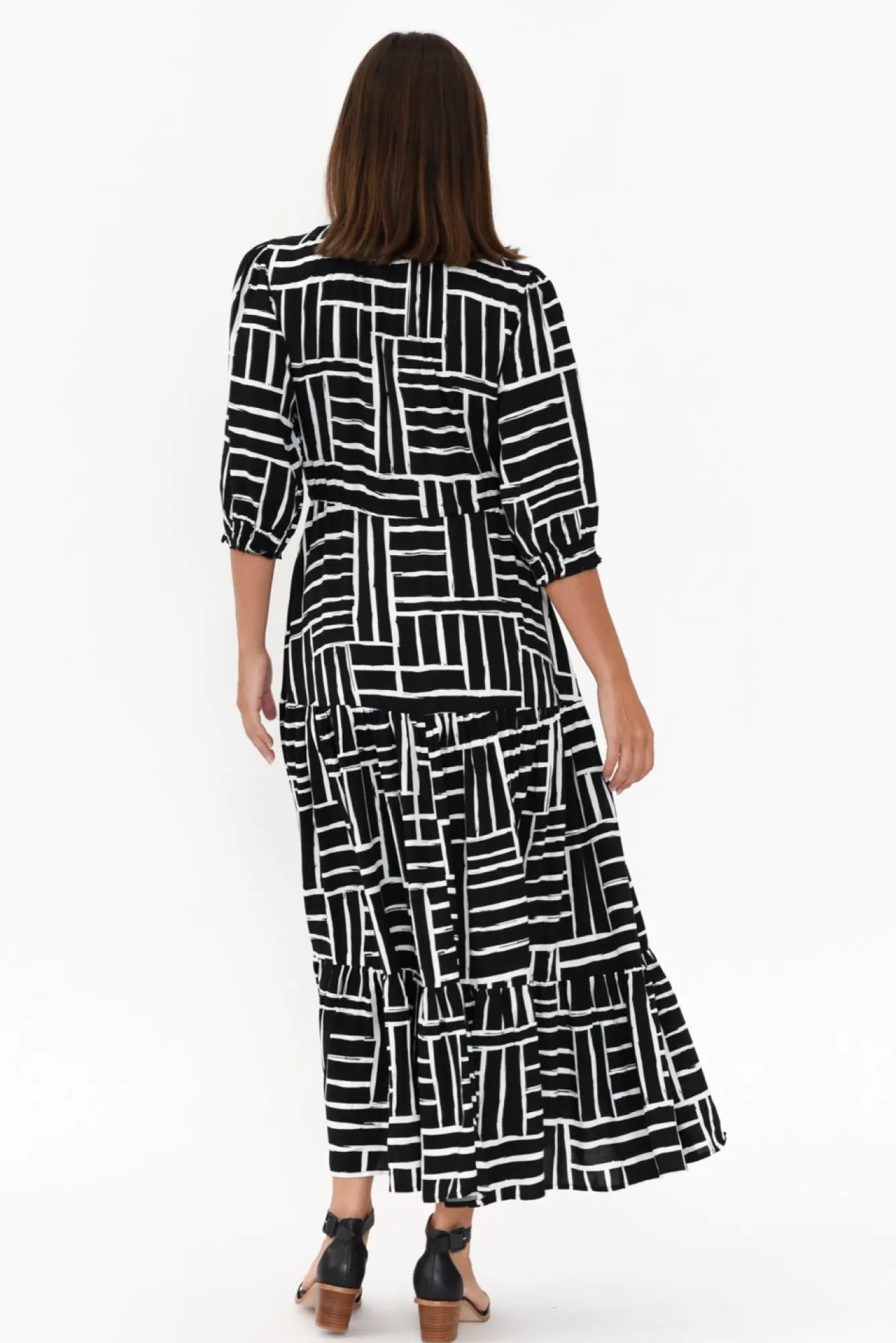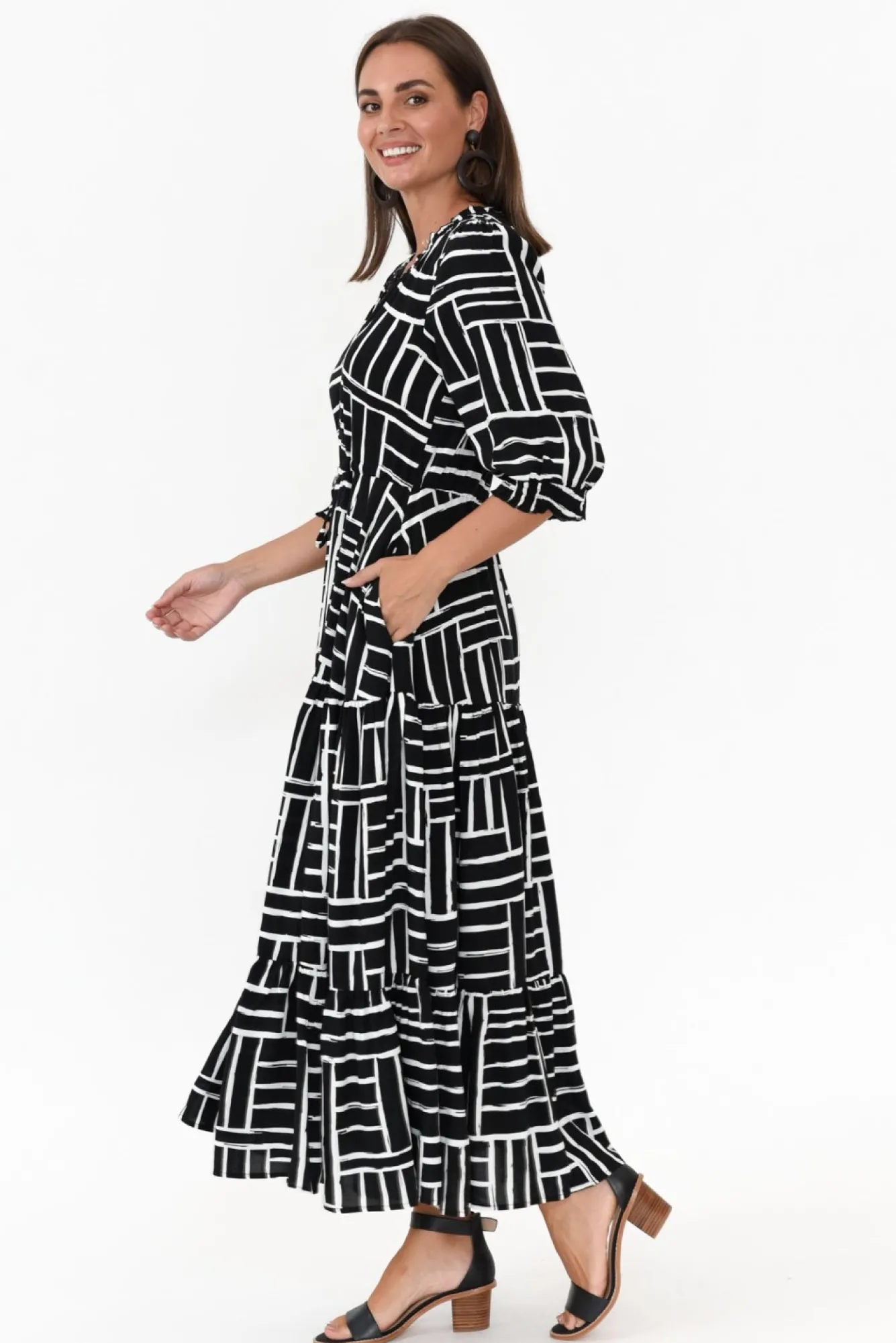 Fit: True To Size. Refer To Size & Fit Tab Below For Specific Size RecommendationNNfabric: 100% ViscoseNcomfortable Lightweight, Non-Stretch Fabric With A Soft And Smooth Hand Feel NNsharp V-Neckline With Frill Trim Around The Neck NNfunctional Button-Down Front From Bust To WaistN3/4 Length Puff Style Sleeves With A Ruched Elasticated Cuff NNflattering And Flowy Tiered A-Line Silhouette NNdrawstring Tassel Tie Waist Creates Shape And Definition Ntwo Side Seam Pockets NNstraight Hemline Falls To Maxi LengthNNNcare: Cool Gentle Hand Wash RecommendedNNcolour: Striking Black And White Abstract Stripe Print