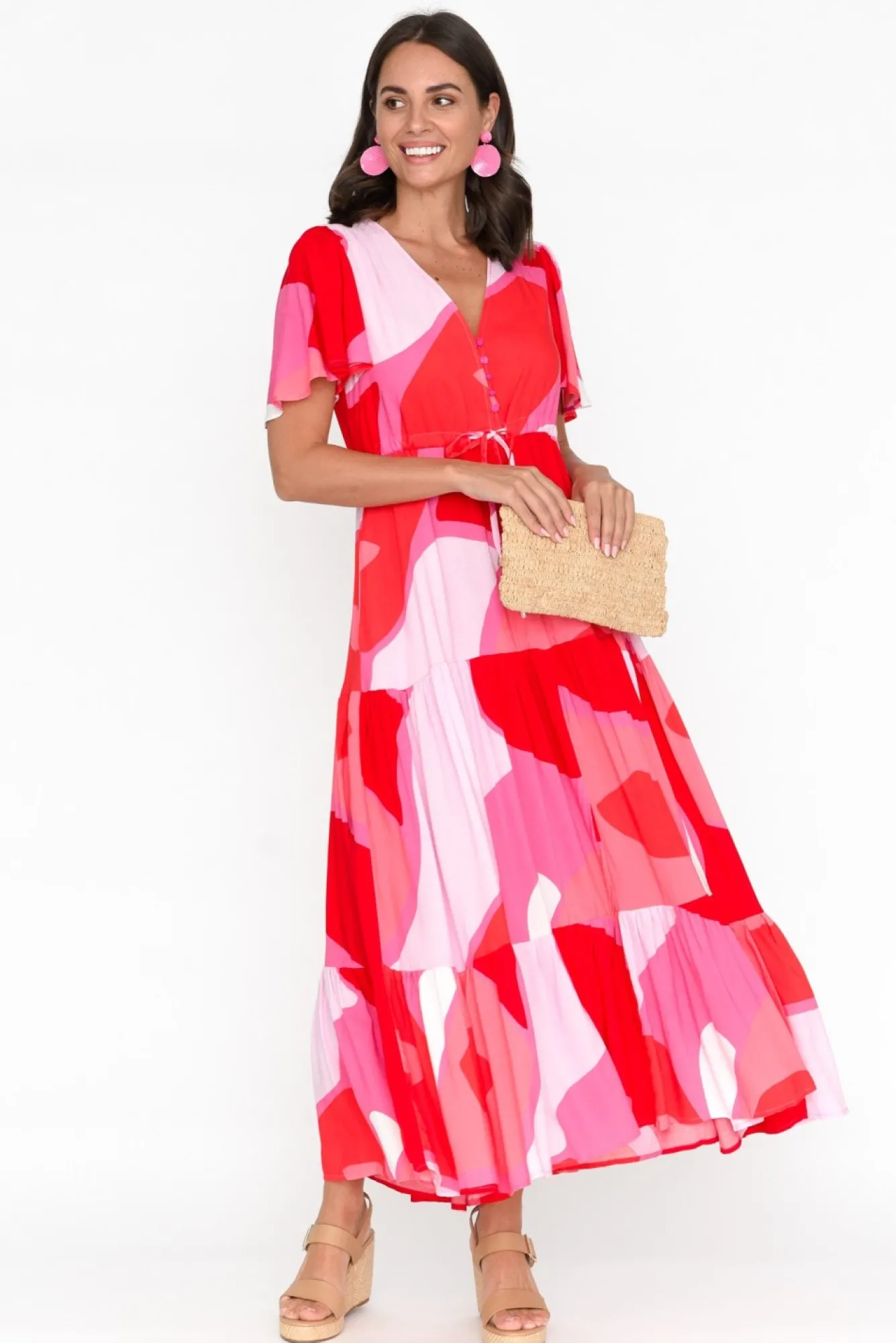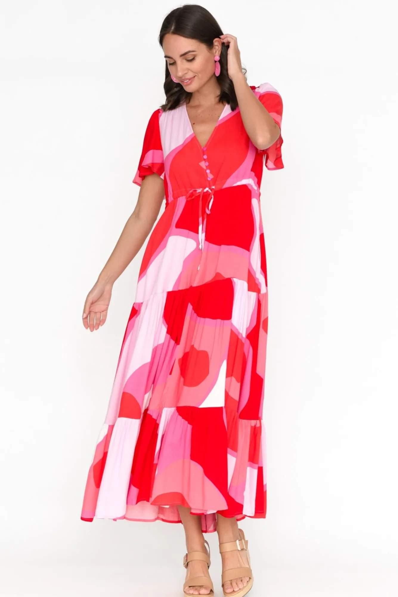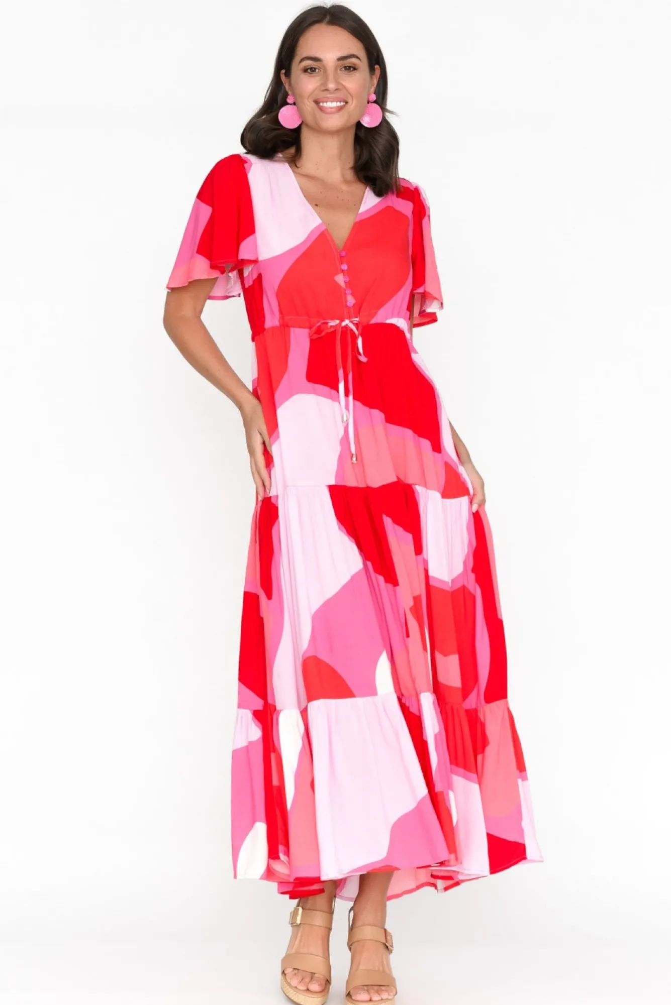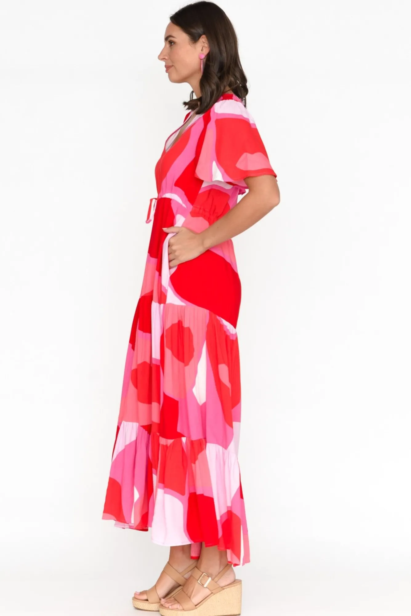 Fit: True To Size. Refer To Size & Fit Tab Below For Specific Size RecommendationNNfabric: 100% ViscoseNlightweight, Non-Stretch Fabric With A Soft And Smooth Hand Feel Nsoft V-Neckline Leads To A Button-Down Front, Ending At The Waist Seam Nlovely Flutter Sleeves With Soft Pleating At The Shoulder NNadjustable Drawstring Waist For Optional Figure Definition Nbreezy A-Line Silhouette Enhanced By Tier Detailing NNtwo Discreet Side Seam Pockets NNhemline Falls To Maxi Length NNNcare: Cool Gentle Hand Wash RecommendedNNcolour: Oversized Abstract Print In Hues Of Raspberry Red And Pink