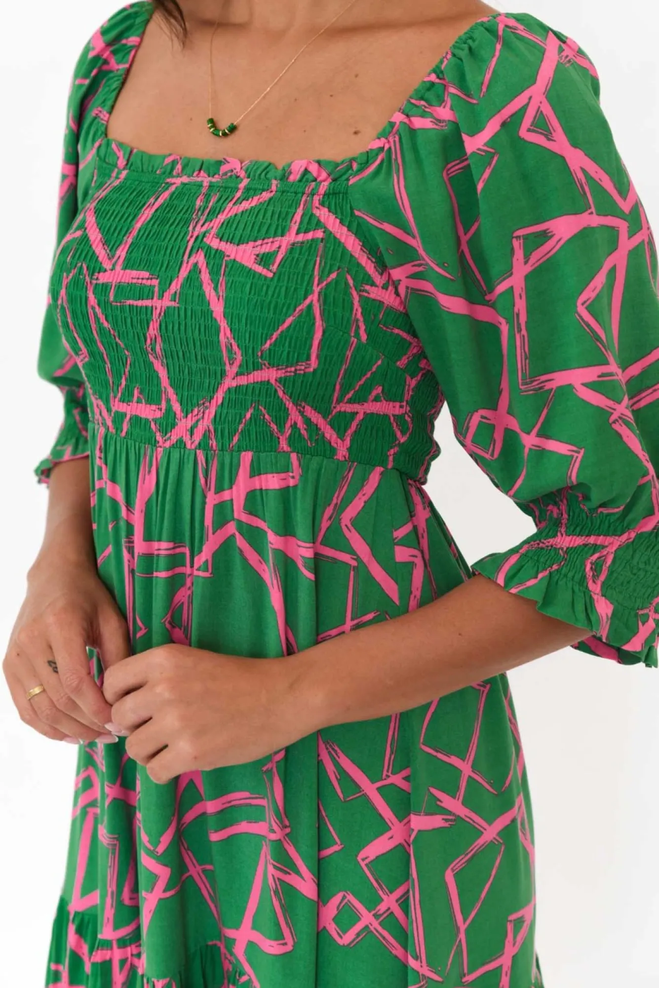 Fit: True To Size. Refer To Size & Fit Tab Below For Specific Size RecommendationNNfabric: 100% Viscose Nlightweight And Soft Fabric With An Elegant DrapeNsleeves Can Be Pulled Down To Create An Off-The-Shoulder Look Or Left On The Shoulders For A Statement Square NecklineNNstretchy, Shirred Bodice Hugs The BustNballoon Sleeves With A Shirred Frill Cuff Give This Style A Dramatic FlairNtiered Fit And Flare SilhouetteNstraight Hem Falls To A Midi LengthNNcare: Cool Gentle Hand Wash RecommendedNNcolour: Forest Green With A Pink Geometric OverlayNNnote: Please See Photos Rather Than Video For Most Accurate Colour