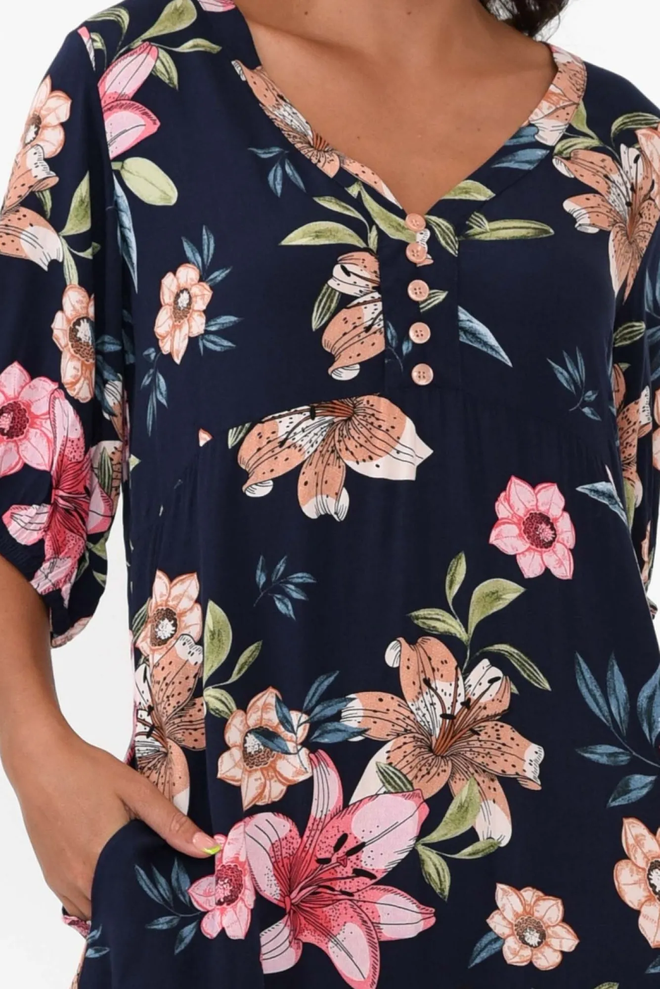 Fit: True To Size. Refer To Size & Fit Tab Below For Specific Size Recommendation NNfabric: 100% RayonNlightweight, Non-Stretch Fabric With Ultra-Soft Hand FeelNNv-Neckline With Faux Buttons Down The BustNNflattering Empire Waist Nhalf-Length Puff Sleeves With Elasticated Cuff Na-Line Silhouette With Two Discreet Hip Pockets Nstraight Hemline Falls Below Knee Length NNNcare: Cool Gentle Hand Wash RecommendedNNcolour: Deep Oceanic Navy Base With Orange Floral Print