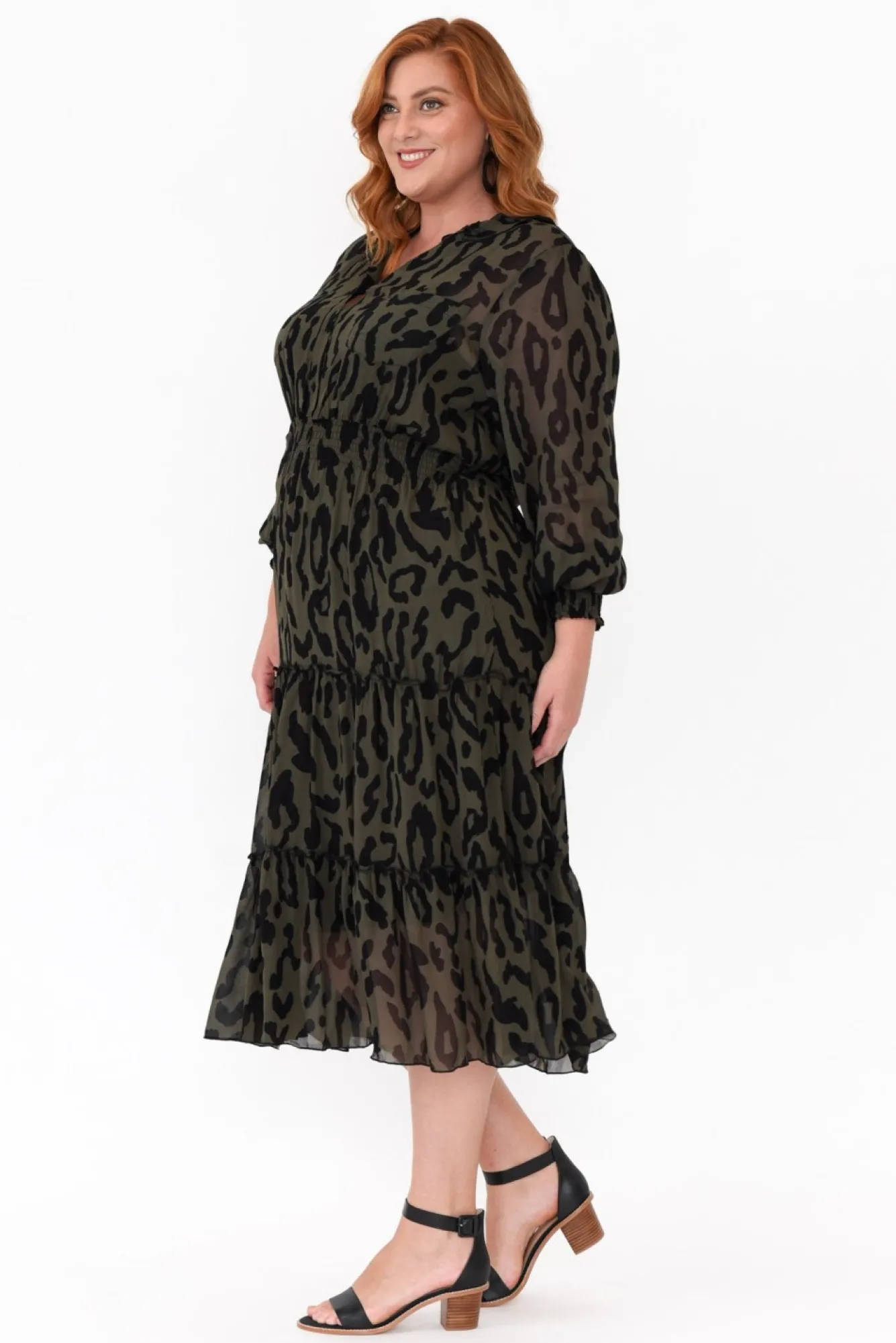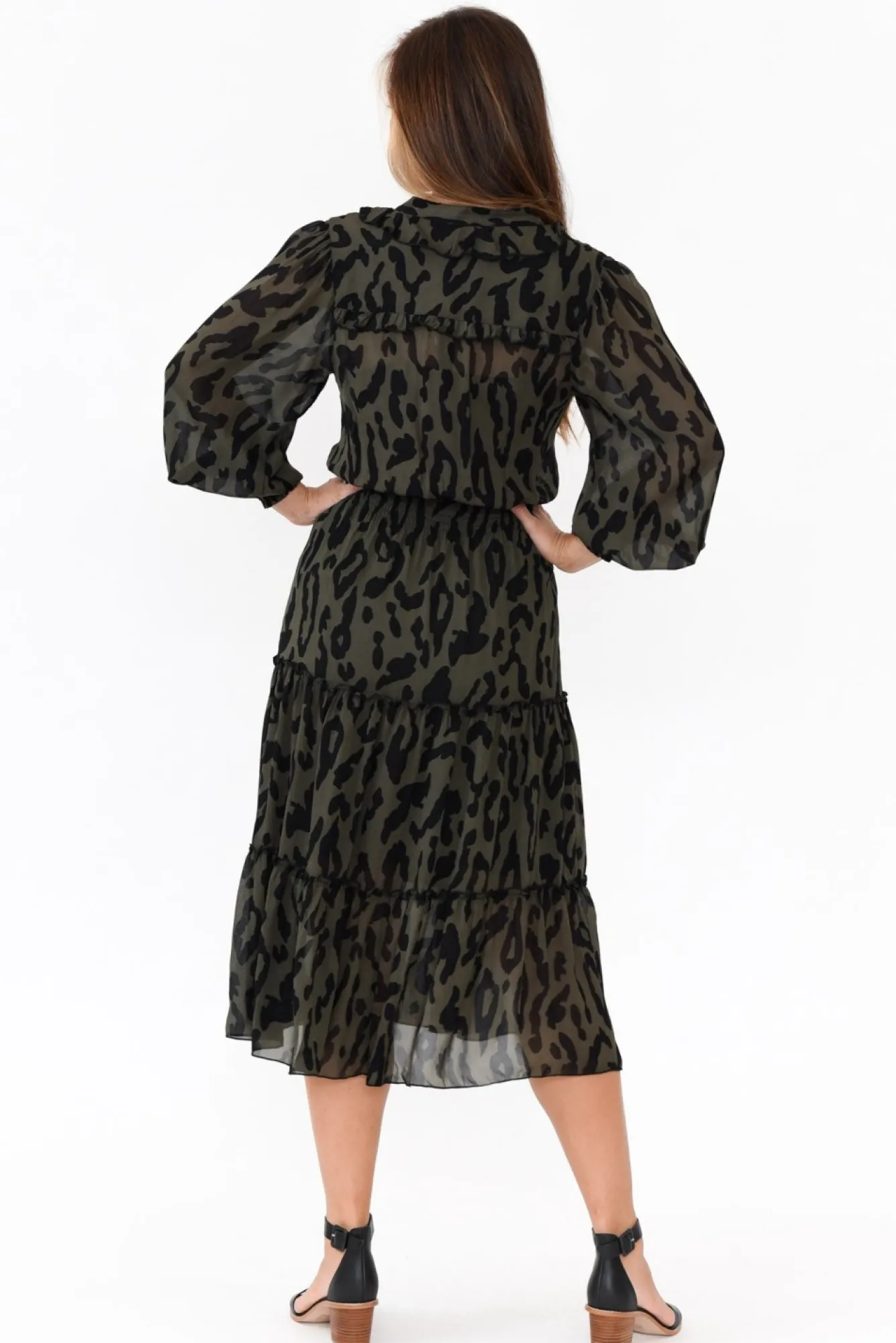 Midi Dresses<Fate Becker Darby Khaki Animal Tier Midi Dress