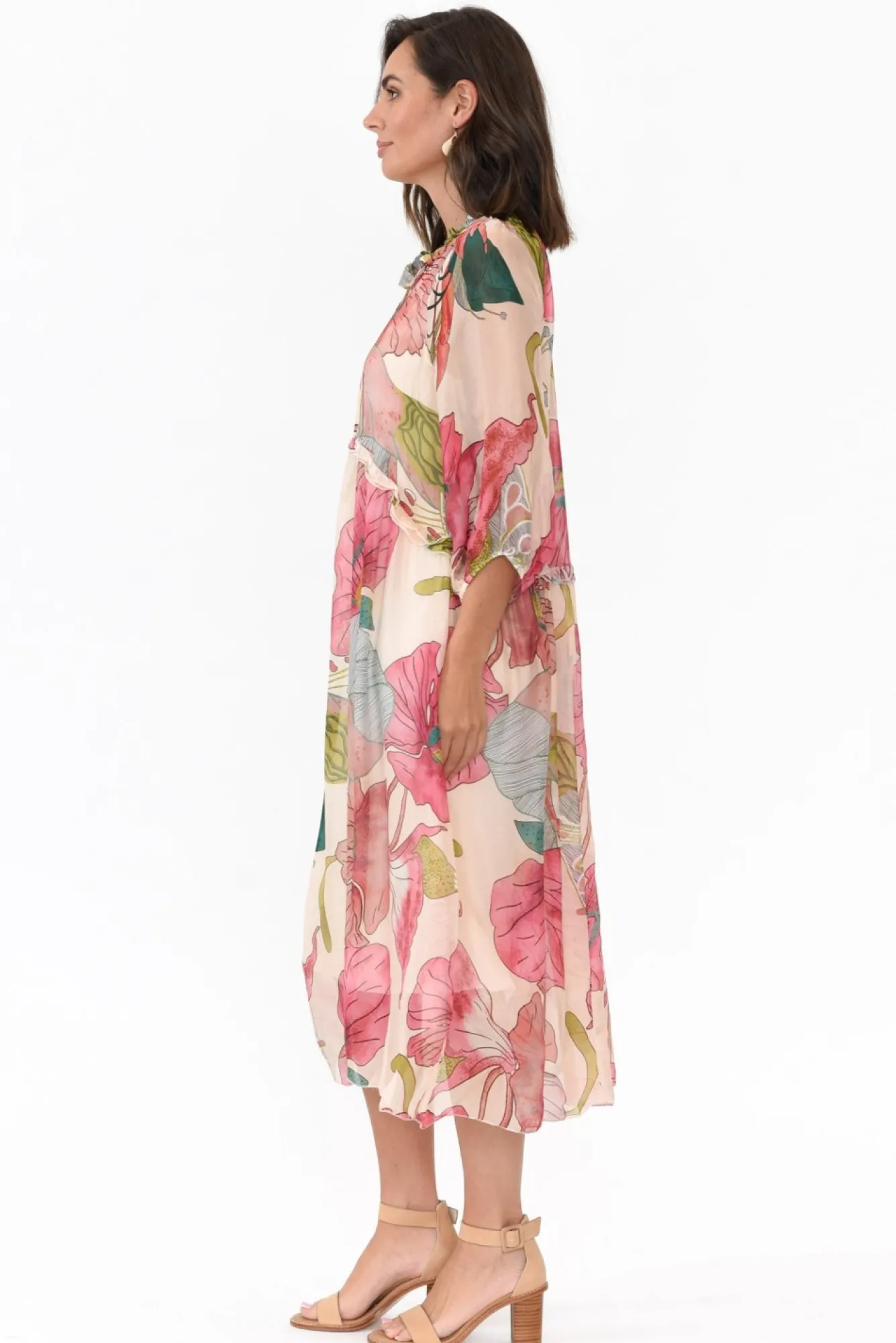 Fit: True To Size. Refer To Size & Fit Tab Below For Specific Size RecommendationNNfabric: Outer: 30% Silk, 70% Viscose Lining: 95%, 5% ElastaneNluxurious Italian Silk Blend With A Lightweight And Ultra-Soft Finish NNsoft And Stretchy Singlet Lining Complements The Sheer OuterNround Ruffle Neckline With A V-Split And Optional TieNNthree-Quarter Length Puff Sleeves With An Elastic Cuff NNruffle Crescent Waistline Na-Line Silhouette Creates A Flattering, Floaty FitNNelegant Midi LengthNNcare: Cool Gentle Hand Wash RecommendedNNNcolour: Champagne Base With A Lovely Pink Floral Overlay