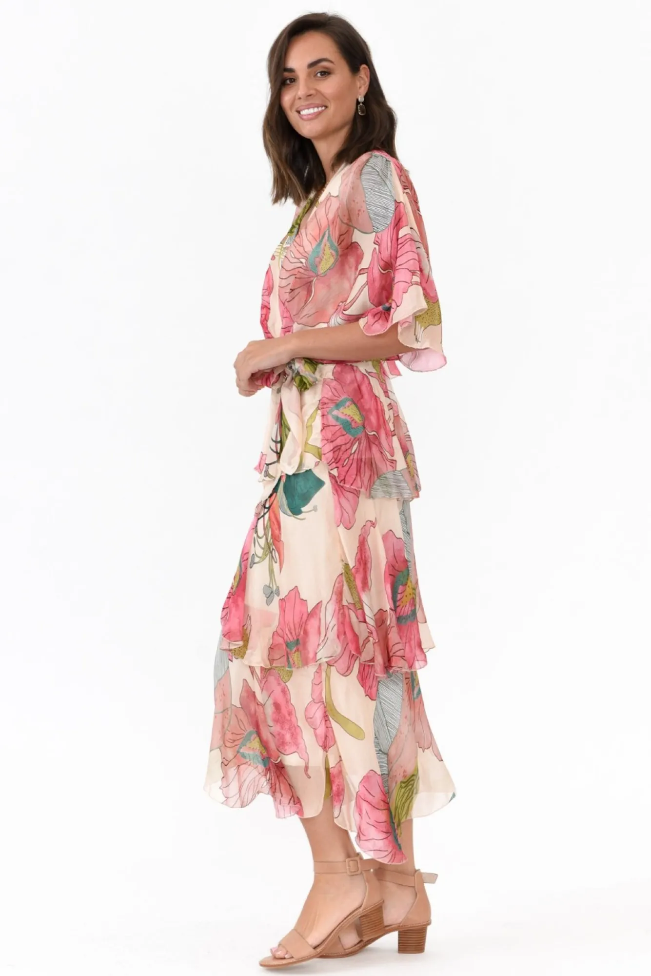 Fit: True. Refer To Size & Fit Tab Below For Specific Size RecommendationNNfabric: Outer: 70% Viscose, 30% Silk Lining: 95% Viscose, 5% ElastaneNNcrafted In Italy From Lightweight, Ultra-Soft And Smooth Silk-Blend FabricNdesigned With A Comfortable Soft And Stretchy Lining Nsharp V-Neckline Flatters The Collarbones NNsheer Half-Length Flutter Sleeves NNwrap-Look Silhouette Enhanced By An Elasticated Waist And Matching Tie NNcascading Layers Of Silk-Blend Fabric Creates A Flattering Tiered Skirt Nfalls To Versatile Midi Length NNcare: Cool Gentle Hand Wash RecommendedNNcolour: Champagne Base With A Lovely Pink Floral Overlay