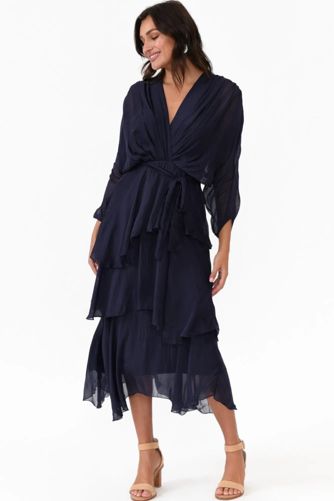 Fit: True. Refer To Size & Fit Tab Below For Specific Size RecommendationNNfabric: Outer: 30% Silk 70% Viscose Lining: 95% Viscose, 5% ElastaneNmade In Italy From Luxurious Silk Blend Fabric With Soft And Stretchy Inner Lining Nv-NecklineNN3/4 Length Transparent Silky Sleeves With Elastic CuffNconcealed Elastic Stretch Waist With Silky BeltNruffled Tiered HemNbelow Knee LengthNNcare: Cool Gentle Hand Wash RecommendedNNcolour: Deep Navy Blue