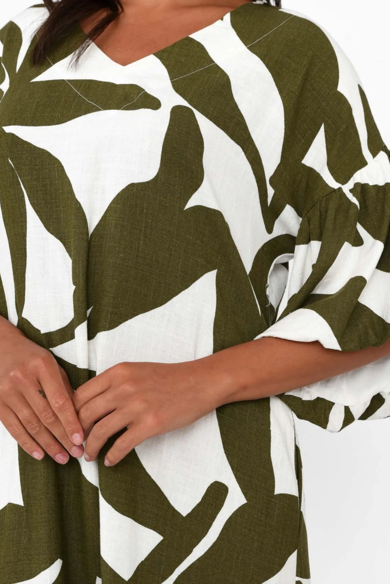 Fit: True To Size. Refer To Size & Fit Tab Below For Specific Size RecommendationNNfabric: 70% Rayon, 30% LinenNlightweight, Non-Stretch Fabric With A Textured Woven Hand Feel NNsharp V-Neckline Defined By Exposed Stitching Detail NNhalf-Length Puff Sleeves Drape Down The Arm NNversatile Straight Silhouette With Optional Thin Waist Tie With Feature Beading NNtwo Discreet Hip Pockets Located In Side Seams NNstraight Hemline With Side Splits For Movement NNfalls To Midi Length NNNcare: Cool Gentle Hand Wash RecommendedNNcolour: Oversized Khaki Leaf Print Over A White Base