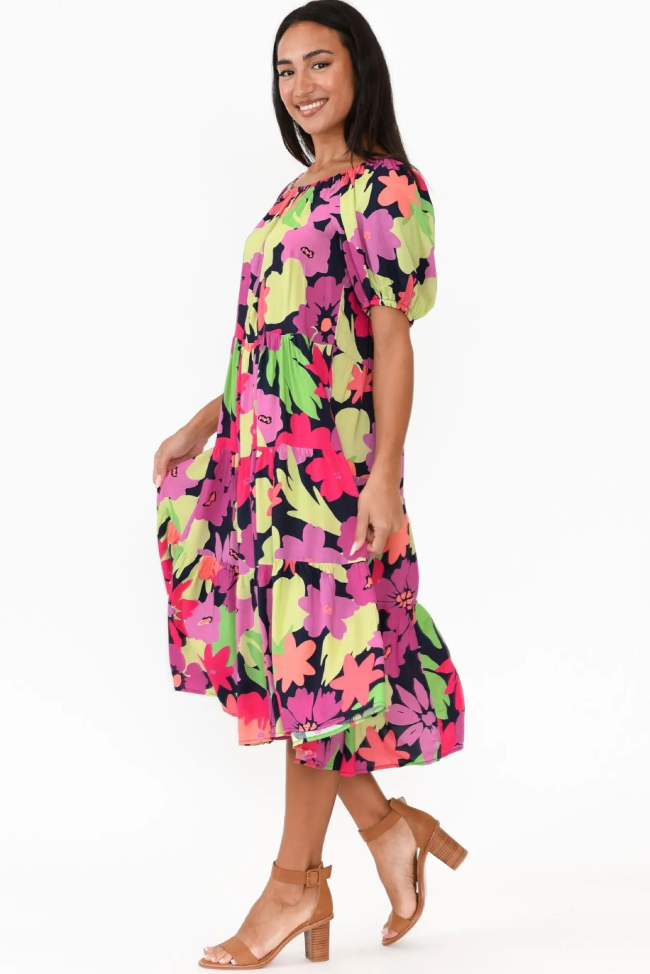 Fit: True To Size. Refer To Size & Fit Tab Below For Specific Size Recommendation NNfabric: 100% RayonNthe Perfect Summer Event-Ready Dress NNlovely Lightweight, Breathable And Soft Fabric Nflattering Off-Shoulder Neckline, Highlights The Decolletage NNcan Also Be Worn On The Shoulders For A More Rounded Neckline Ngorgeous Half Length Puff Sleeve Nrelaxed, Tiered A-Line Silhouette – A Summer Staple Must-Have!Nfrill Hem Falls Below Knee LengthNNNcare: Cool Gentle Hand Wash RecommendedNNcolour: Black Base With Lovely Tropical Floral Print