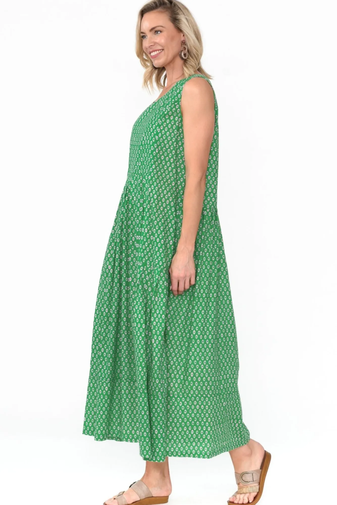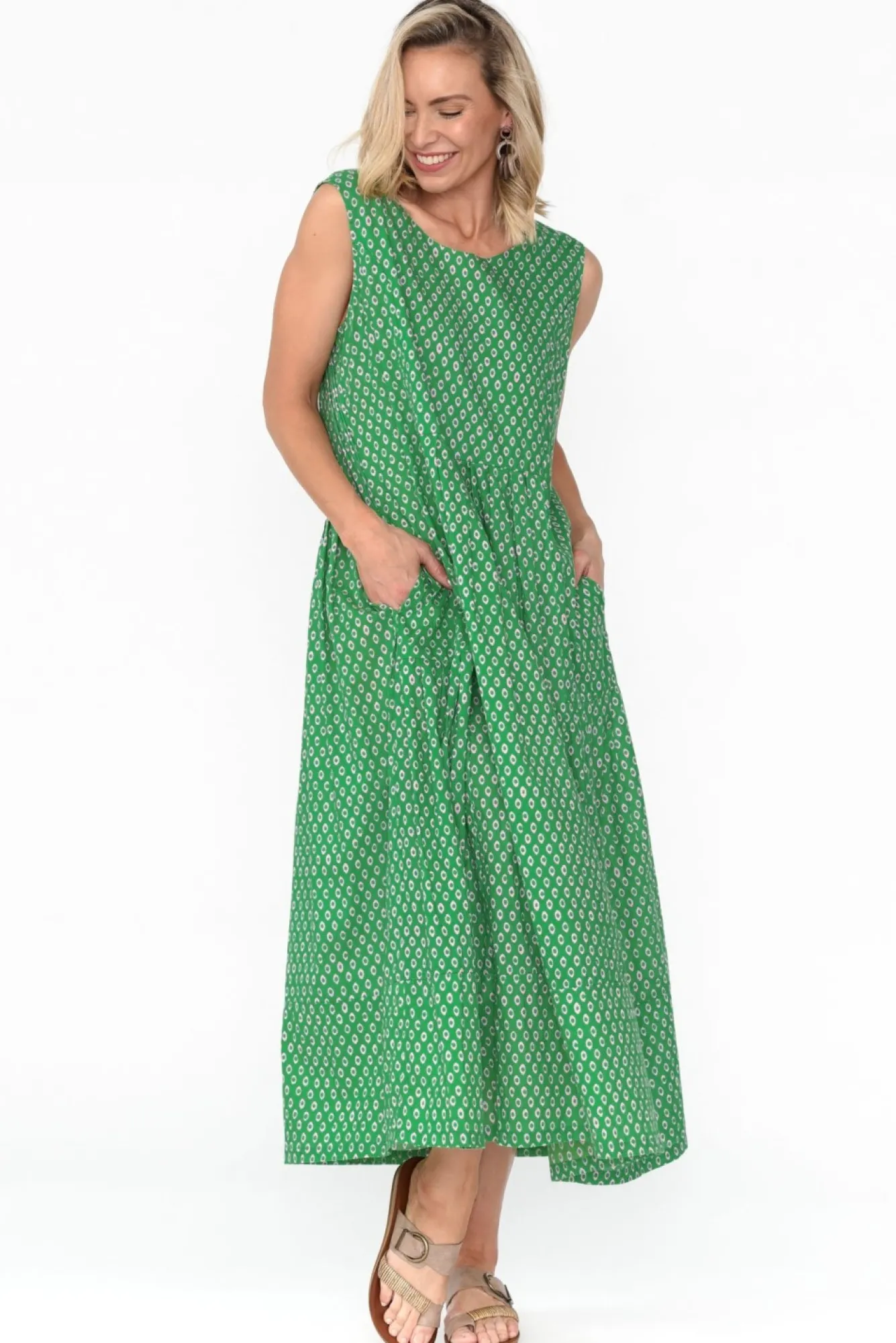 Fit: True To Size. Refer To Size & Fit Tab Below For Specific Size RecommendationNNfabric: 100% CottonNNlightweight, Soft And Wonderfully Breathable FabricNclassic Rounded Neckline Site Below CollarbonesNNsummery Sleeveless Design NNsoft Pleats Fall From The Floaty, Non-Stretch WaistbandNtiered A-Line Silhouette NNtwo Discreet Hip PocketsNNstraight Hem Falls To A Maxi Dress NNNcare: Cool Gentle Hand Wash RecommendedNNcolour: Bright Green With A Sleek, Understated Circle Pattern