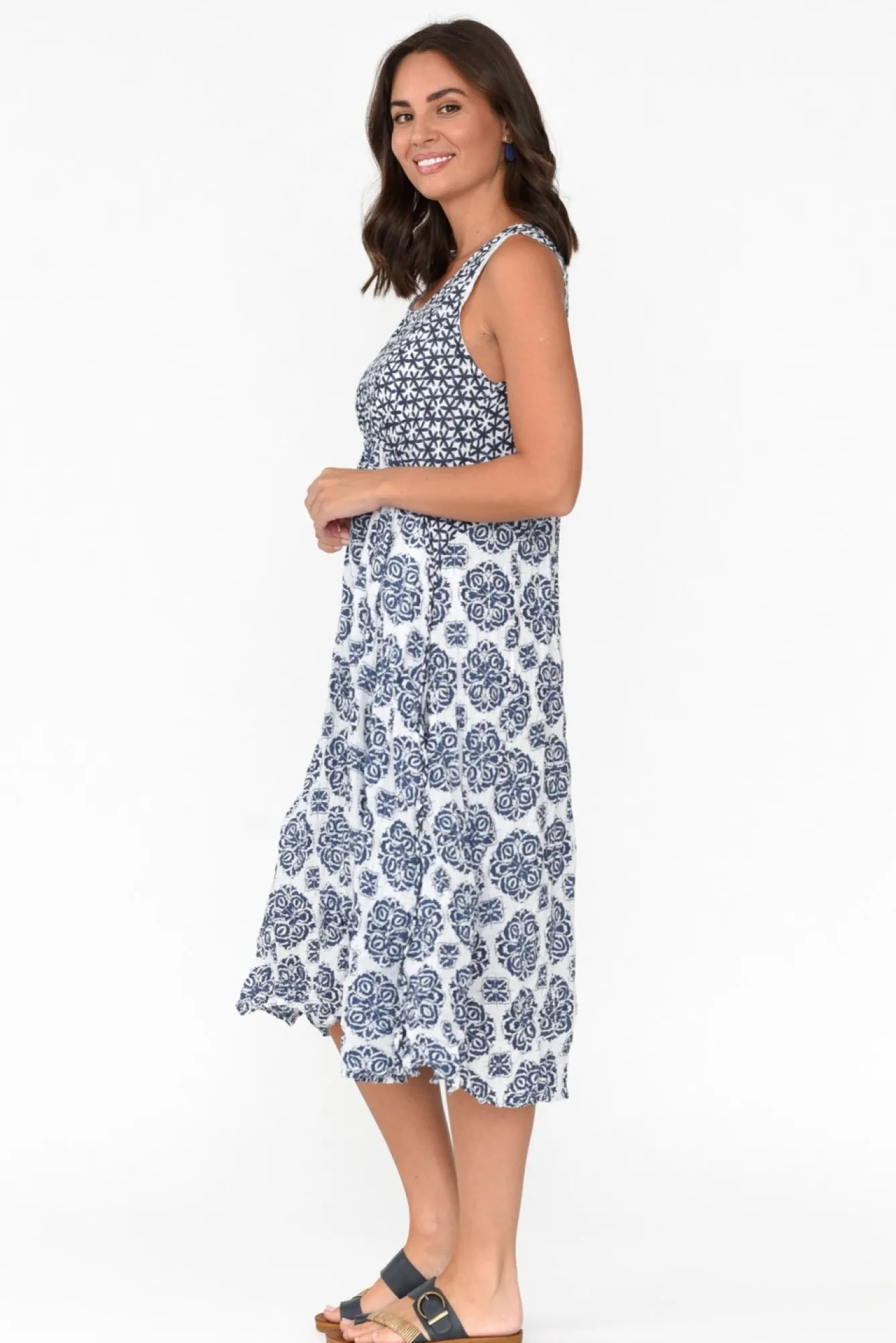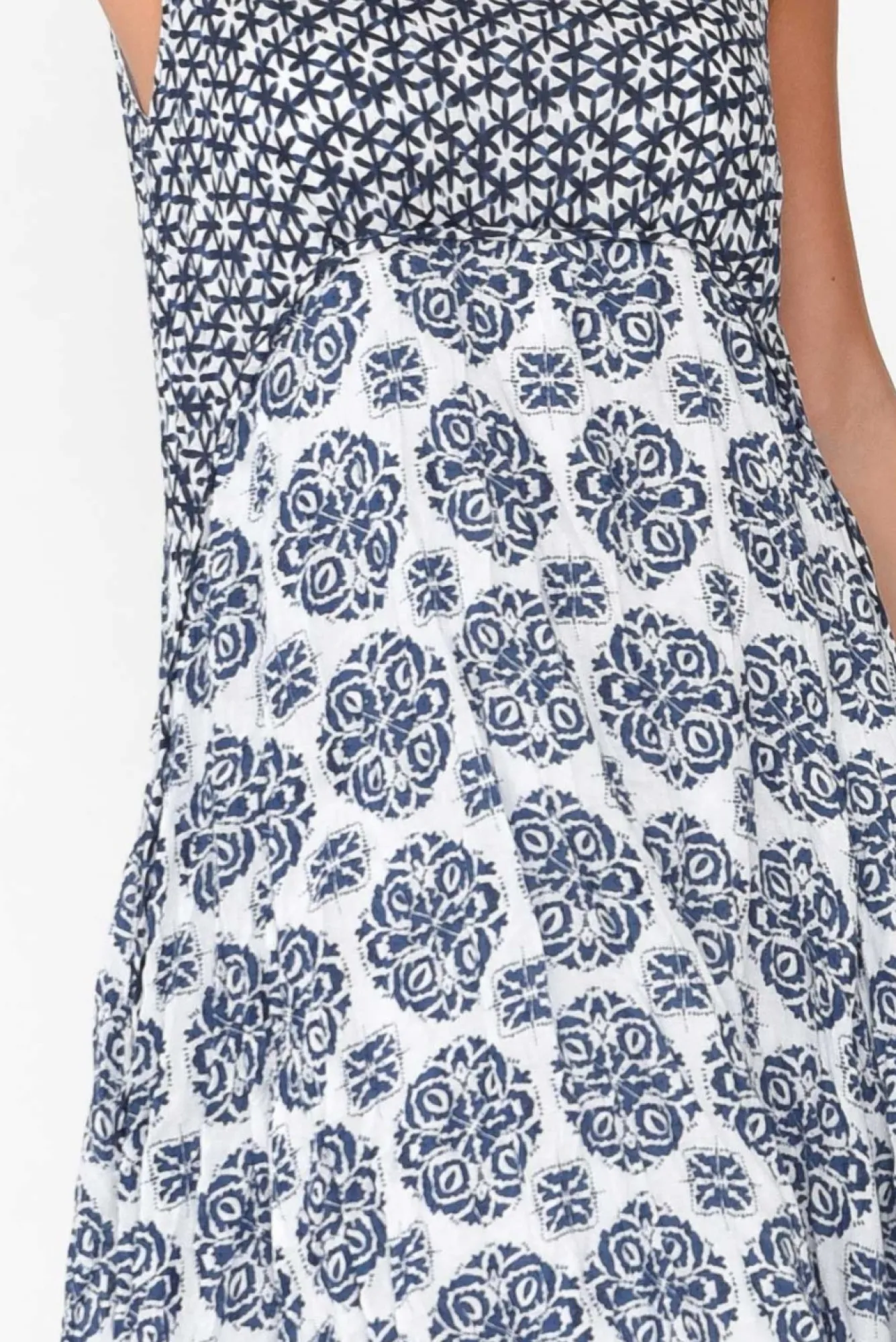 Fit: True. Refer To Size & Fit Tab Below For Specific Size RecommendationNNfabric: 100% CottonNlightweight, Soft And Breathable Non-Stretch Crinkle CottonNNcrinkle Cotton Is The Ultimate No-Fuss Fabric – Just Roll Up And Go, No Ironing Required!Nfeaturing A Classic, Round Neckline And Sleeveless Design Ncurved Under Bust Seam Separtes The Two Abstract PrintsNflattering Flowy A-Line SilhouetteNtwo Generous Pockets Located At The HipNfully Lined Design Adds Volume And Coverage To The DesignNgarment Falls To Midi LengthNNcare: Cool Gentle Hand Wash RecommendedNNcolour: Lovely Navy Abstract Fiesta Print