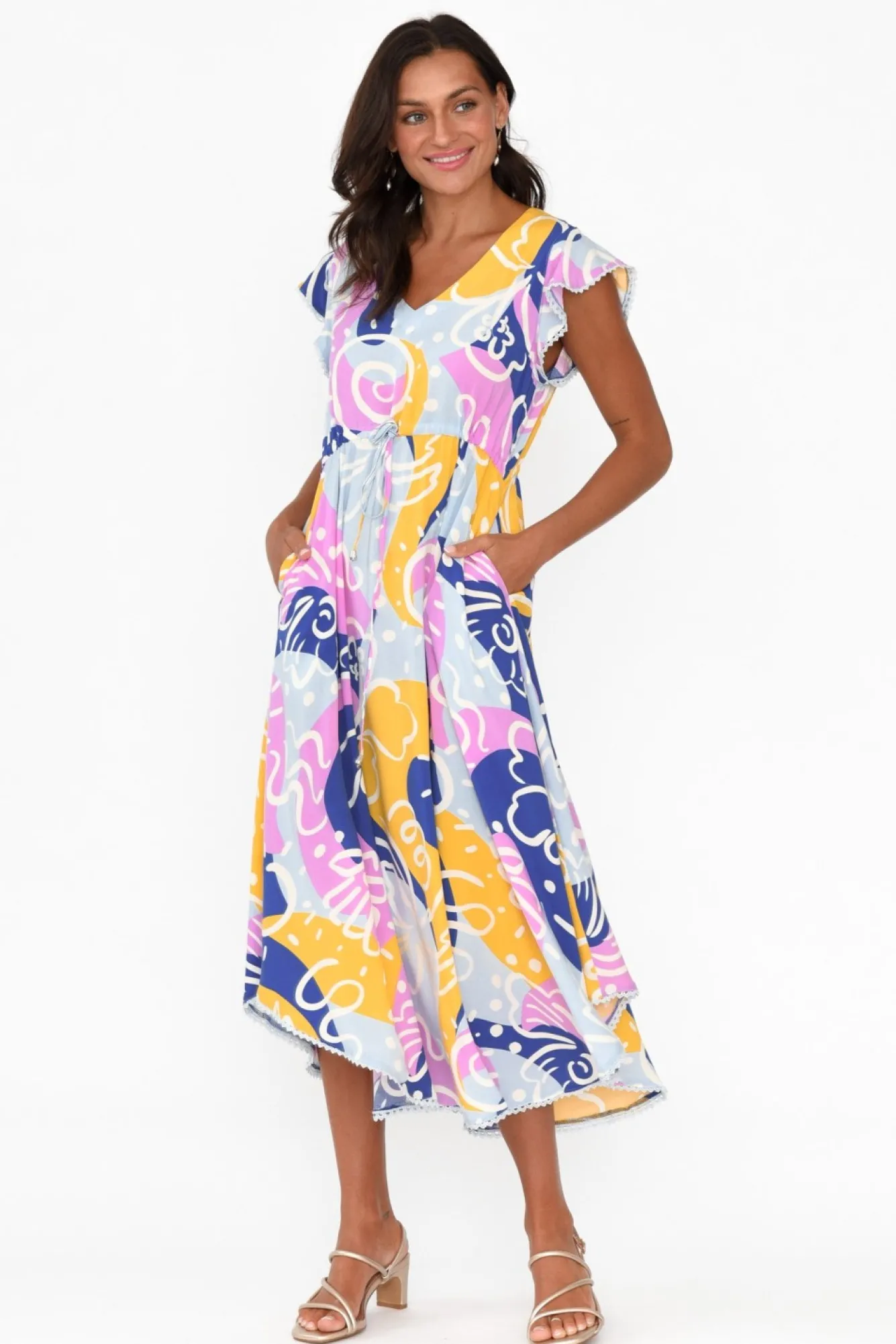 Fit: True. Refer To Size & Fit Tab Below For Specific Size RecommendationNNfabric: 100% RayonNlovely Soft Rayon With A Non-Stretch, Lightweight FinishNNstriking V-NecklineNshort Flutter Sleeves Perfect For Warmer WeatherNbroderie Anglaise Trim At The Sleeves And Hem Elevate This StyleNdrawstring At The Waist Offers A Personalised FitNNtwo Functional Side Hip PocketsNcurved Hemline Falls To A Midi Length NNcare: Cool Gentle Hand Wash RecommendedNNcolour: Abstract Print Featuring Shades Of Yellow, Blue And Purple