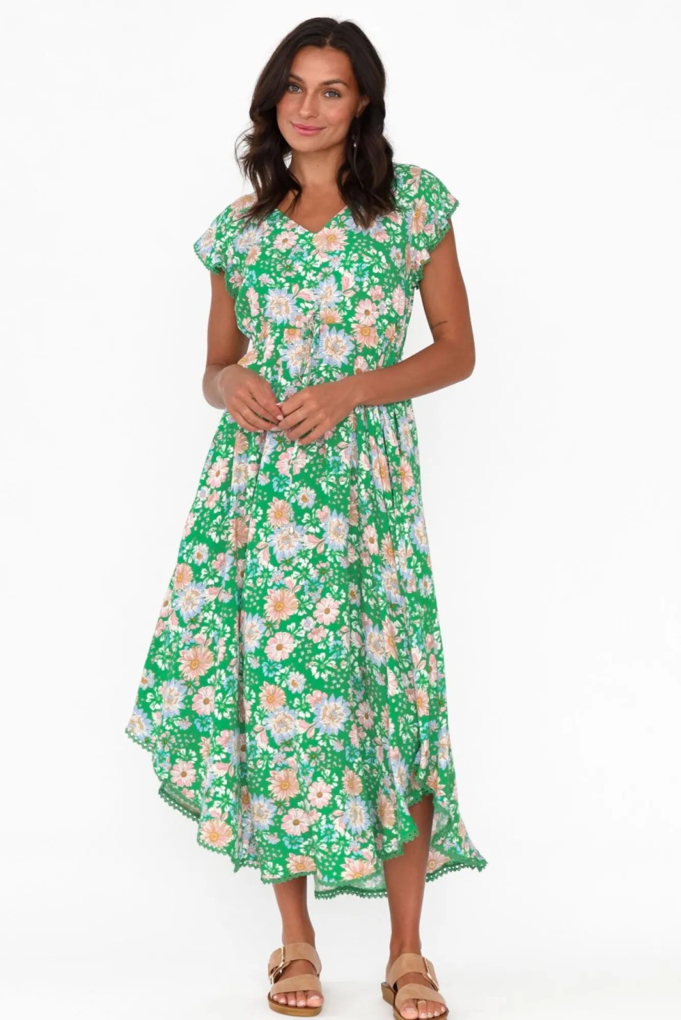 Fit: True. Refer To Size & Fit Tab Below For Specific Size RecommendationNNfabric: 100% RayonNlovely Soft Rayon With A Non-Stretch, Lightweight FinishNNflattering V-Neckline Complements Short Flutter SleevesNbroderie Anglaise Trim At The Sleeves And Hem Elevate This StyleNempire Waist With A Drawstring TieNNtwo Functional Side Hip PocketsNcurved Hemline Falls To A Midi Length NNcare: Cool Gentle Hand Wash RecommendedNNcolour: Bright Green Base With A Dainty Flower Overlay
