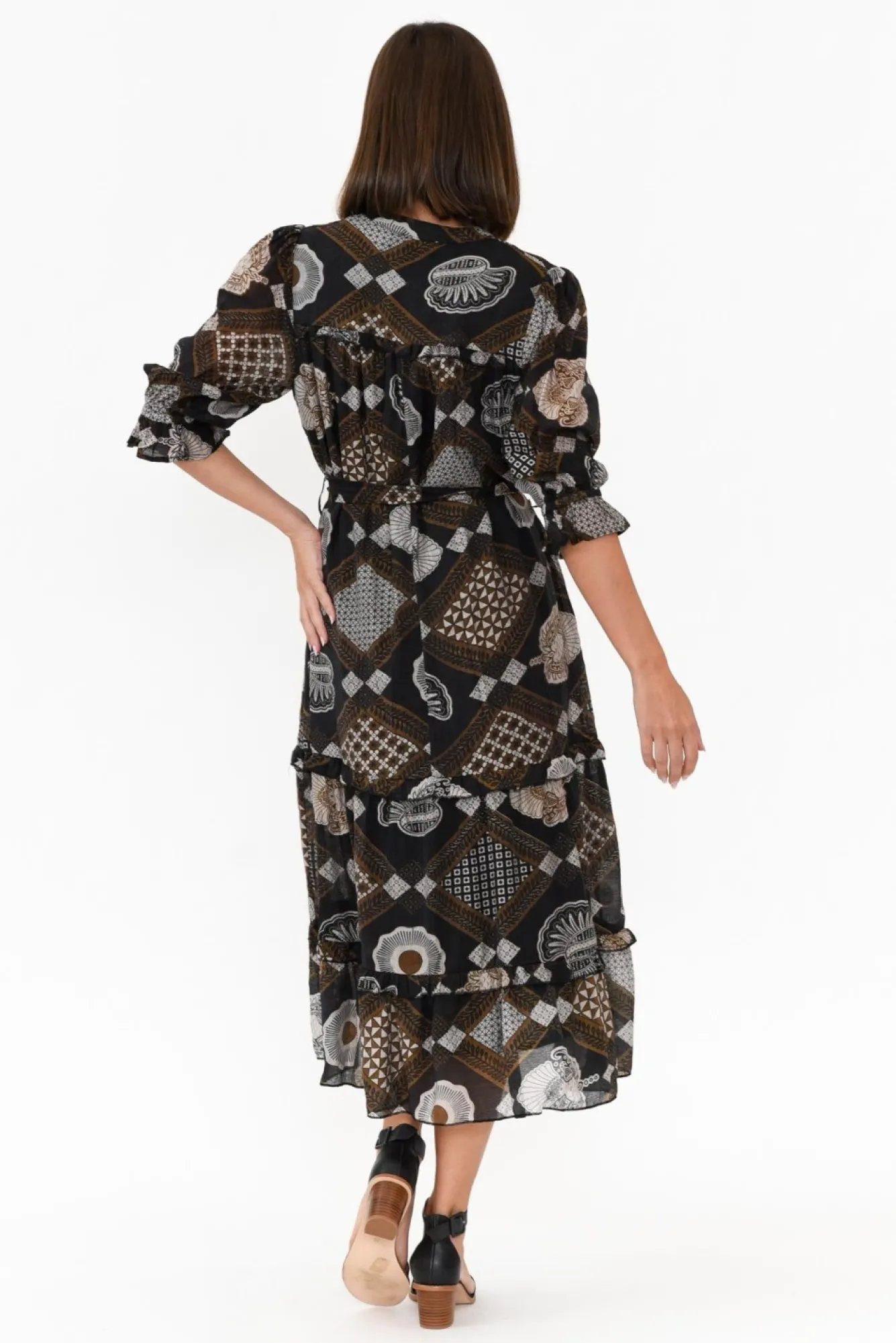 Fit: True To Size. Refer To Size & Fit Tab Below For Specific Size RecommendationNNfabric: Outer: 70% Viscose, 30% Spandex Lining: 100% CottonNlovely Lightweight And Slightly Sheer Outer With A Plain Lining To Provide Extra CoverageNbanded Collar With A V-Split NNhalf-Length Sleeves With An Elastic Cuff And Frilled HemNNdelicate Ruffles Sit Along The Collarbones And Skirt To Elevate This Style Nsimple And Flattering A-Line SilhouetteNdetachable Fabric Belt Can Be Used To Accentuate The Natural Waist NNelegant Midi Length StyleNNcare: Cool Gentle Hand Wash RecommendedNNcolour: Brown Base With An Intricate Geometric Overlay