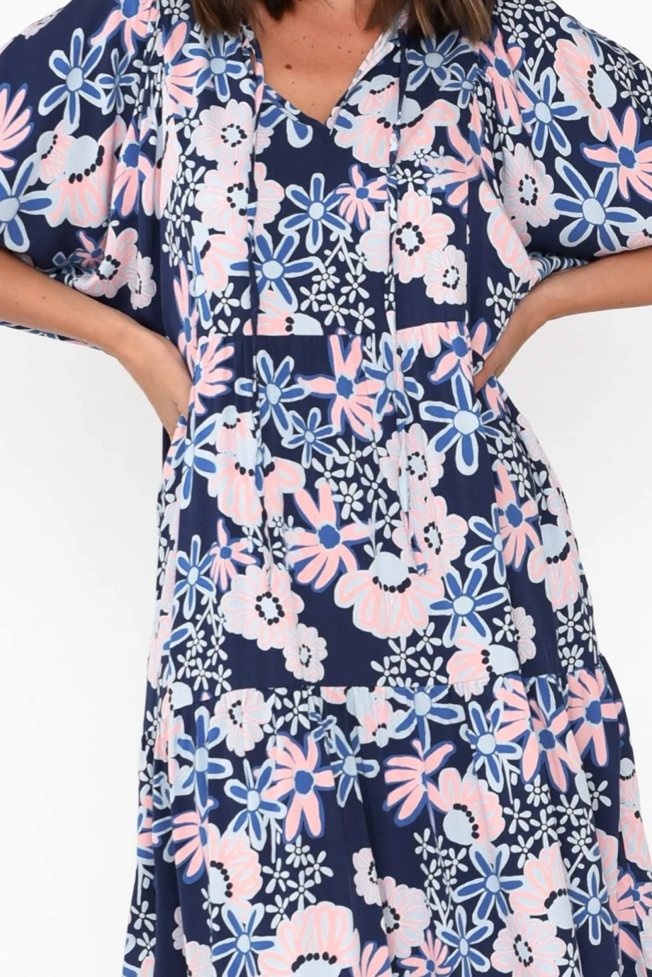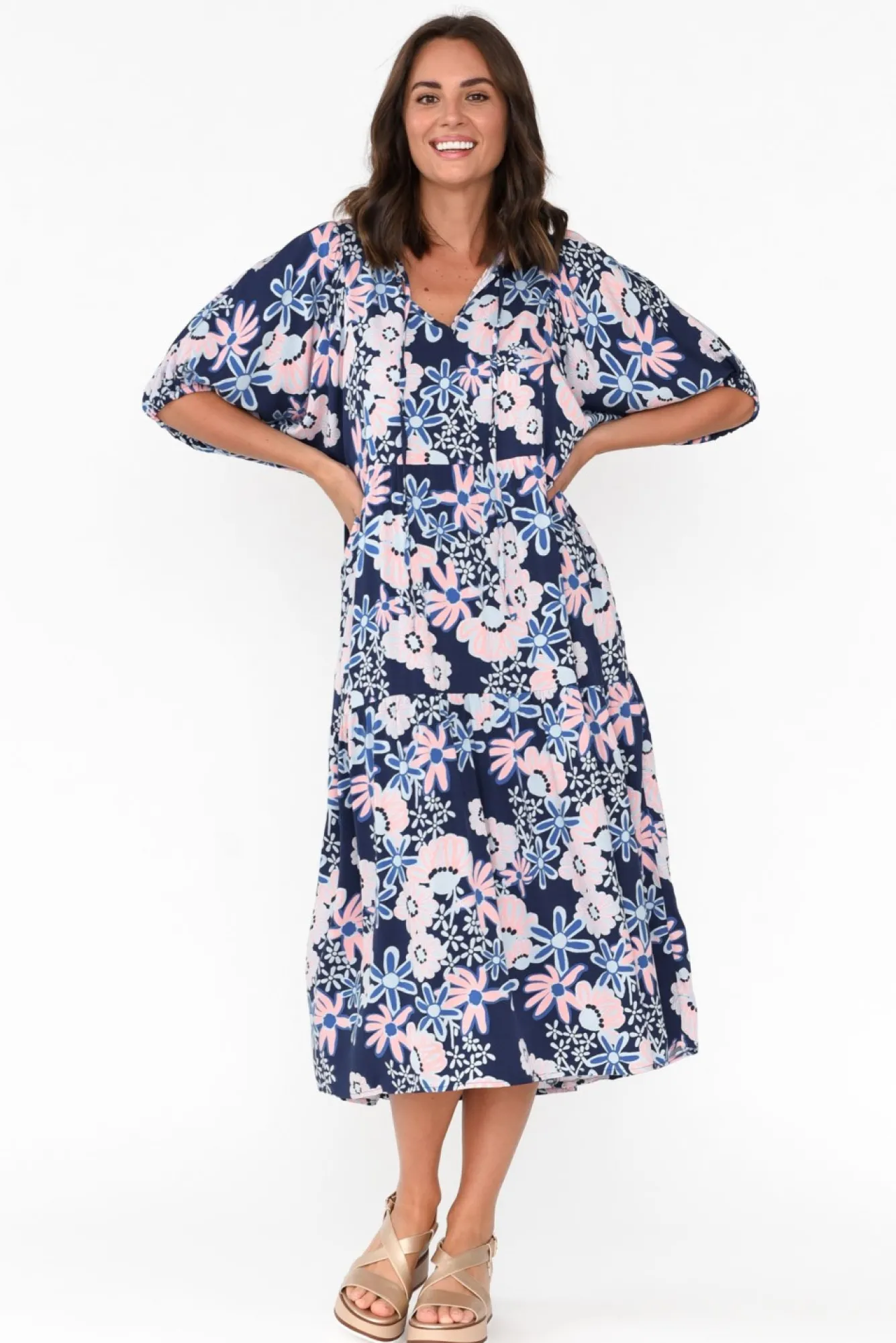 Fit: Relaxed Fit. Refer To Size & Fit Tab Below For Specific Size Recommendation NNfabric: 100% RayonNsoft, Lightweight And Non-Stretch Rayon With A Smooth Hand Feel NNfeature V-Split Neckline With An Adjustable Tie Detail NNhalf-Length Puff Sleeves With An Elasticated Cuff And Soft Pleating NNa-Line Silhouette Features Tiers And Has A Relaxed FitNNtwo Discreet Side Seam Pockets Nstraight Hemline Falls Below Knee Length NNNcare: Cool Gentle Machine Wash RecommendedNNcolour: Classic Navy Base With A Stunning Pink And Blue Floral Print