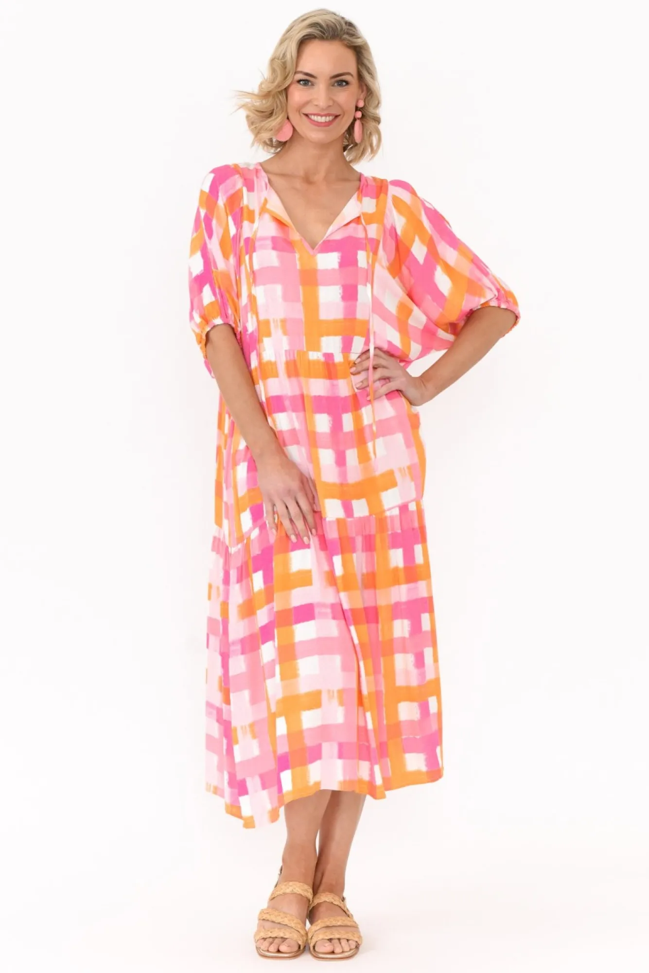 Fit: Relaxed Fit. Refer To Size & Fit Tab Below For Specific Size Recommendation NNfabric: 100% RayonNsoft, Lightweight And Non-Stretch Rayon With A Smooth Hand Feel NNfeature V-Split Neckline With An Adjustable Tie Detail NNhalf-Length Puff Sleeves With An Elasticated Cuff And Soft Pleating NNrelaxed Tiered A-Line Silhouette NNtwo Discreet Side Seam Pockets Nstraight Hemline Falls Below Knee Length NNNcare: Cool Gentle Machine Wash RecommendedNNcolour: Fun Pink And Orange Watercolour-Style Check Print