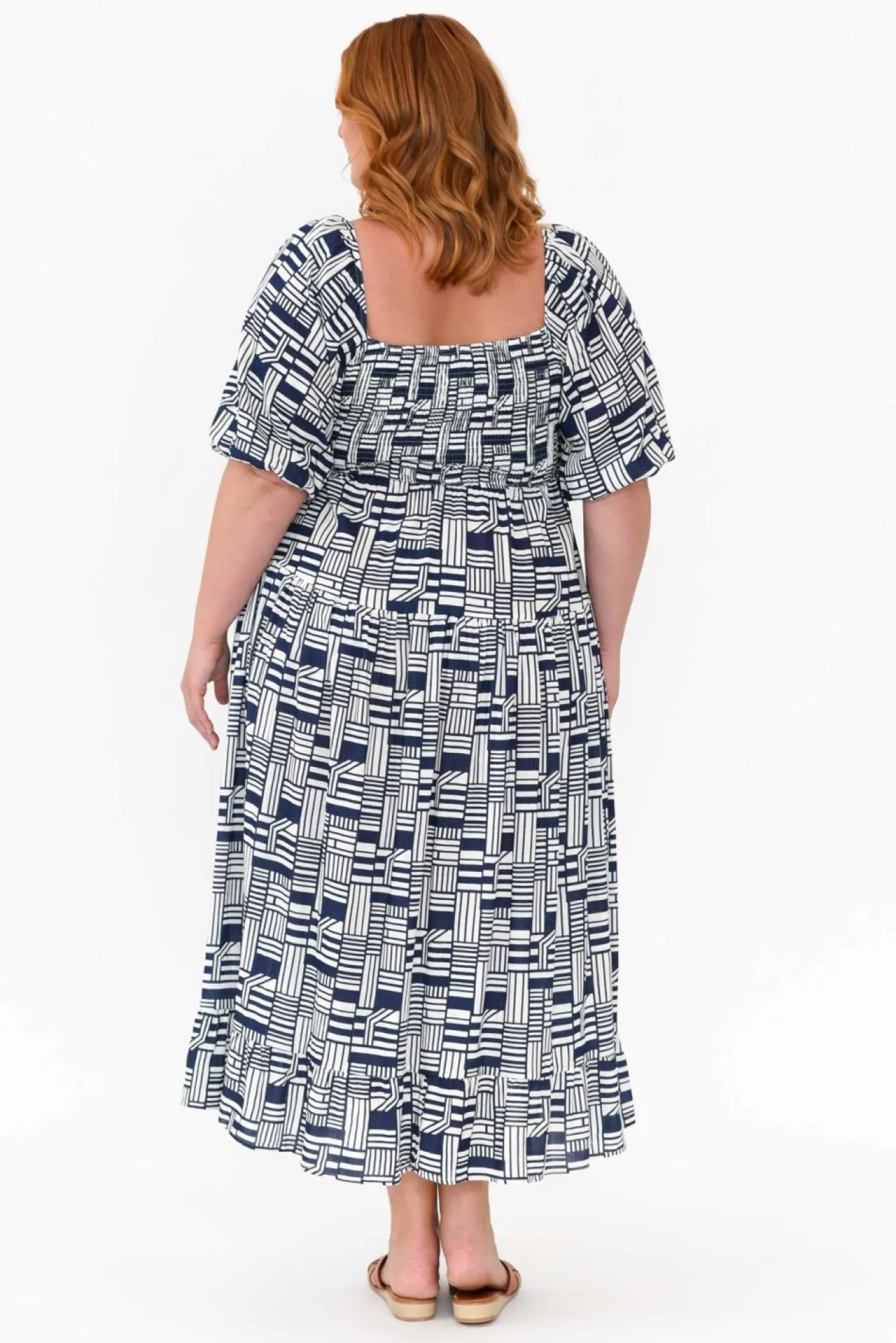 Midi Dresses<Silver Wishes Hansen Navy Geo Shirred Dress