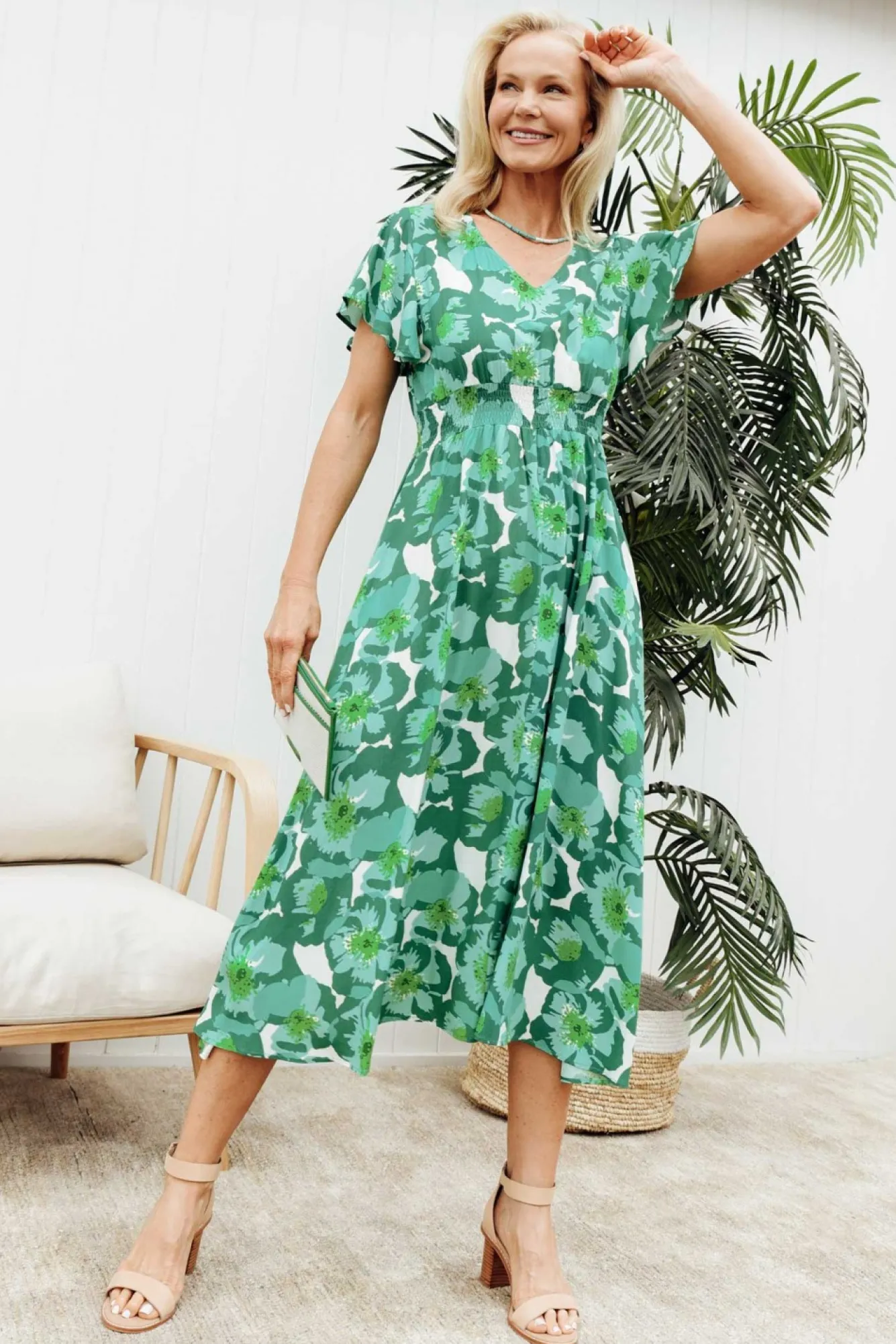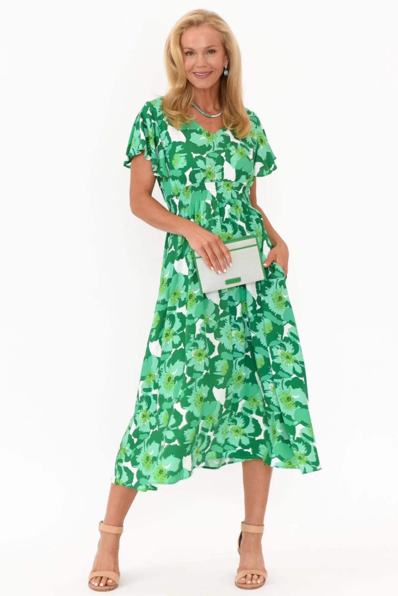 Fit: True. Refer To Size & Fit Tab Below For Specific Size Recommendation NNfabric: 100% RayonNa Lightweight And Comfortable Summer Style Made From Non-Stretch Fabric NNclassic V-Neckline With Fun Short, Flutter SleevesNNshirred Elastic Waistband Define The Figure Nflattering Fit-And-Flare Silhouette With Flowy SkirtNtwo Generous Pockets Located Slightly Below The HipNstraight Hemline Falls To Maxi LengthNNcare: Cool Gentle Hand Wash RecommendedNNcolour: Beautiful Green Florals