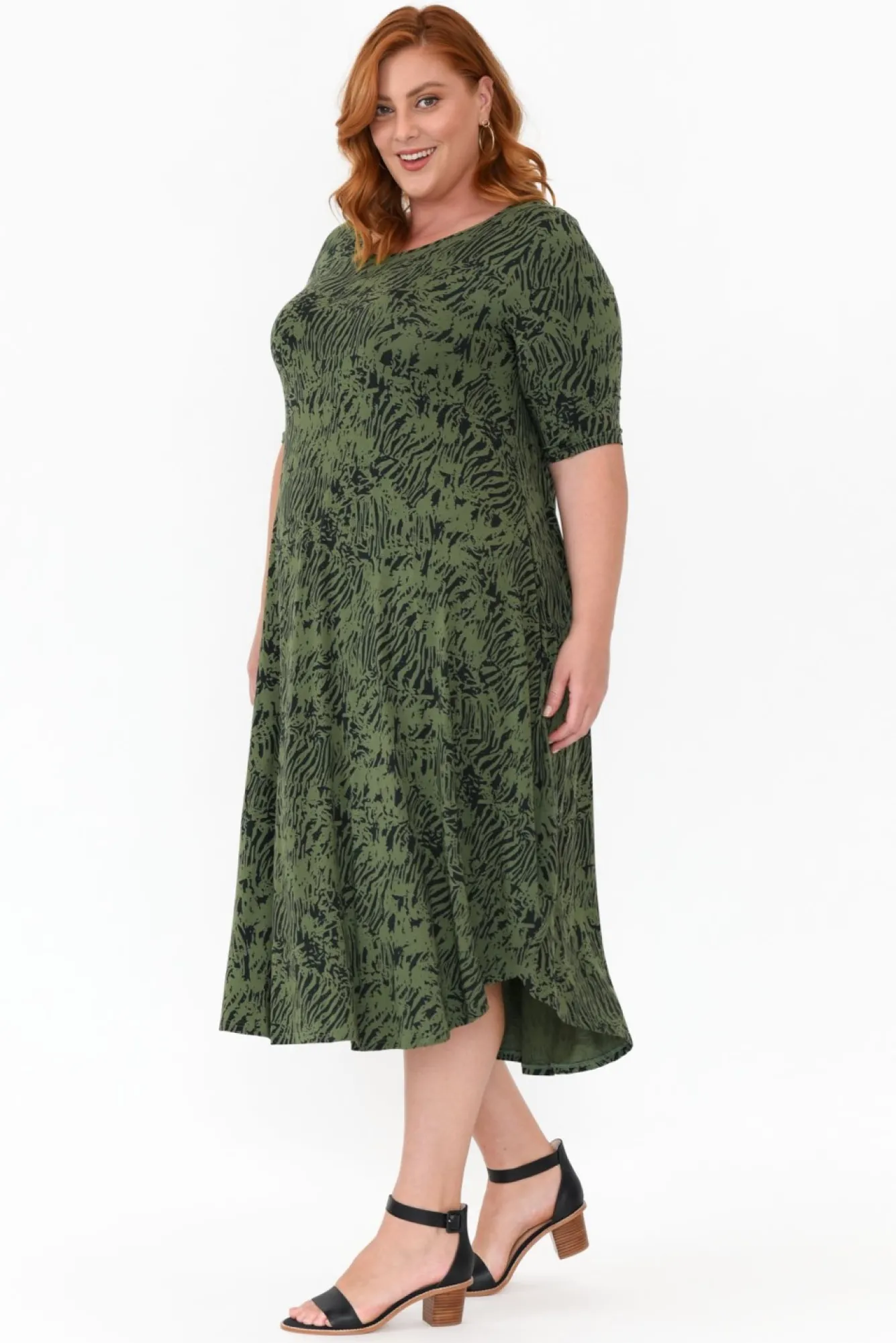 Fit: True. Refer To Size & Fit Tab Below For Specific Size RecommendationNNfabric: 96% Micromodal®Air, 4% LycraNmicro Modal Fabric Has A Lightweight And Buttery Soft Feel And Is Ultra-StretchyNmade From Sustainably Sourced Beechwood FibresNclassic Round Neckline And Half-Length SleevesNfeature Voluminous Skirt Is Complimented By The Fitted Torso Nrounded Hem Falls To A Below-Knee Midi LengthNpart Of Our Tani Clothing CollectionNNcare: Cool Gentle Machine Wash RecommendedNNcolour: Lovely Green Base With An Abstract Tiger Print
