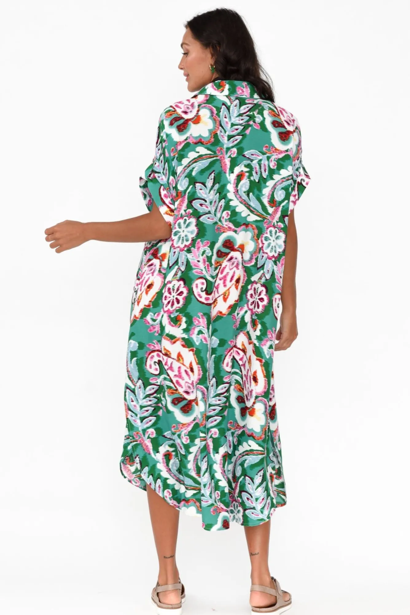 Fit: True To Size. Refer To Size & Fit Tab Below For Specific Size RecommendationNNfabric: 100% RayonNlovely Lightweight, Non-Stretch Rayon Designed With A Soft And Smooth Feel NNclassic Collared Neckline Leads To Two Feature Buttons Nhalf-Length Sleeves With A Button Tab Detail Nbreezy A-Line Silhouette NNtwo Discreet Hip Pockets Located In Side Seams NNcurved Hemline With Side Splits For Ease-Of-Movement NNfalls To A Versatile Midi Length NNcare: Cool Gentle Hand Wash RecommendedNNcolour: Abstract Garden Print Over A Green Base