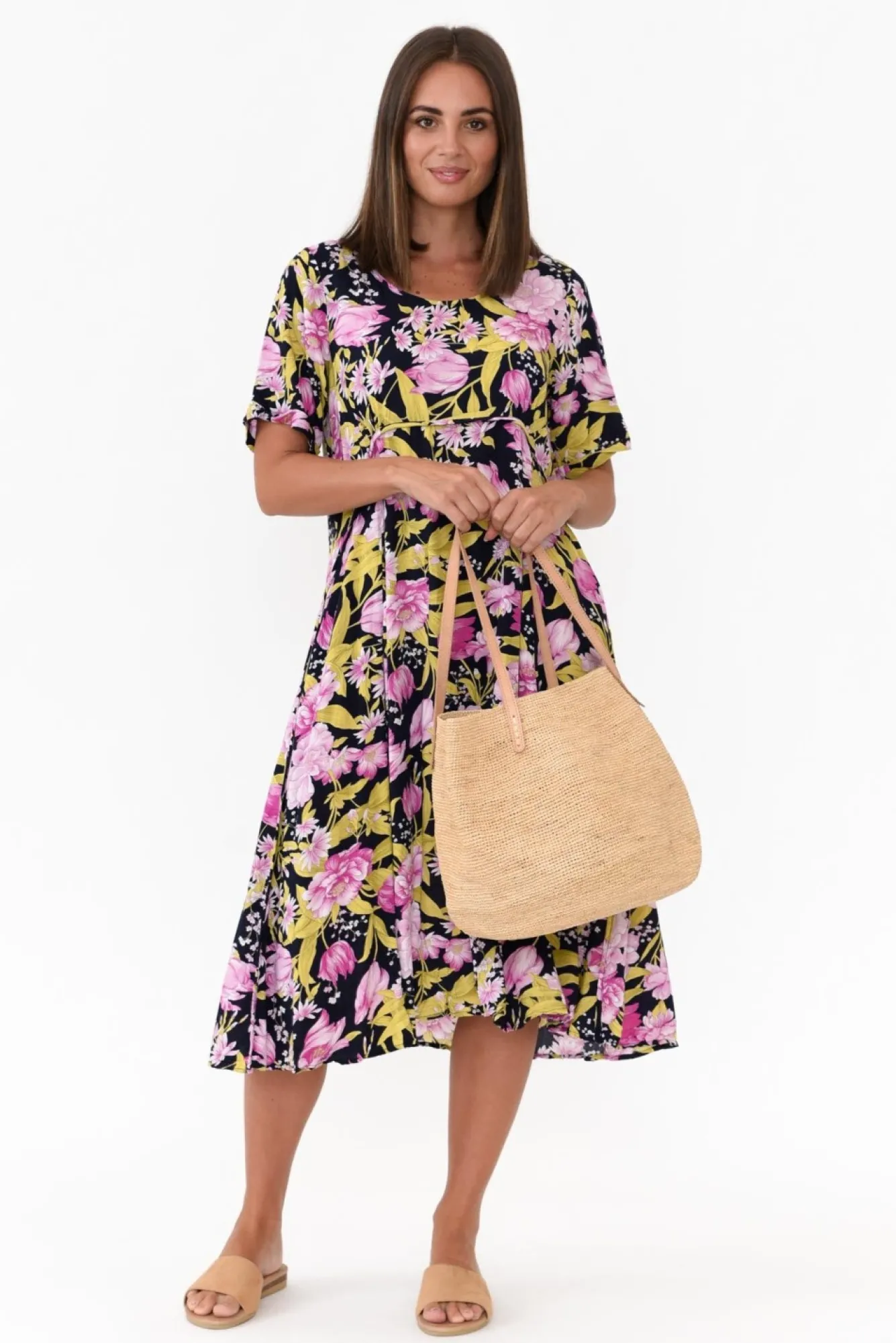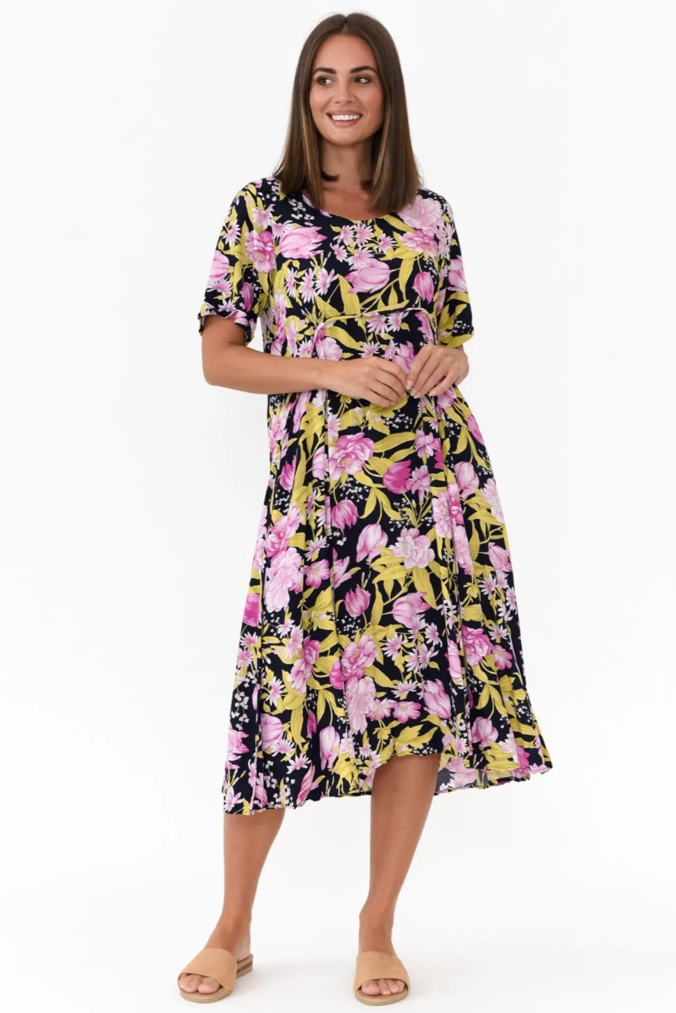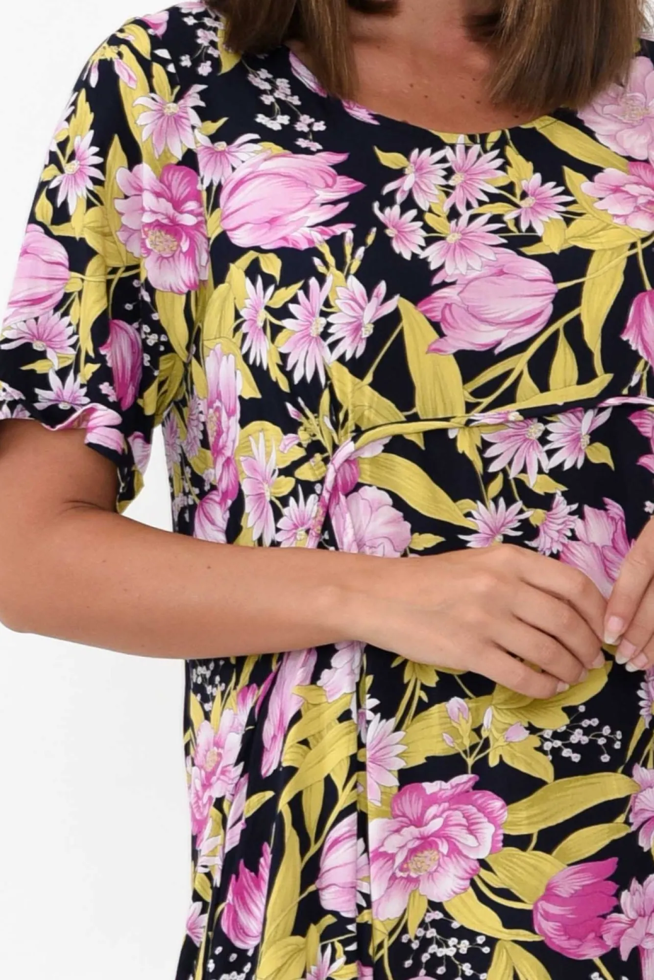 Fit: True To Size. Refer To Size & Fit Tab Below For Specific Size Recommendation NNfabric: 100% Rayon Nlightweight And Soft Rayon Drapes Perfectly Nflattering Mid Length Straight SleevesNa-Line Relaxed Silhouette With A Peak Seam Detail NNtwo Discreet Hip PocketsNNslightly Curved Hem Falls Just Below Knees NNcare: Cool Gentle Hand Wash RecommendedNNcolour: Navy Base With A Detailed Pink And Green Floral PrintNNnote: Length Measurement May Vary Between Colours, Please Check The Relevant Size Charts