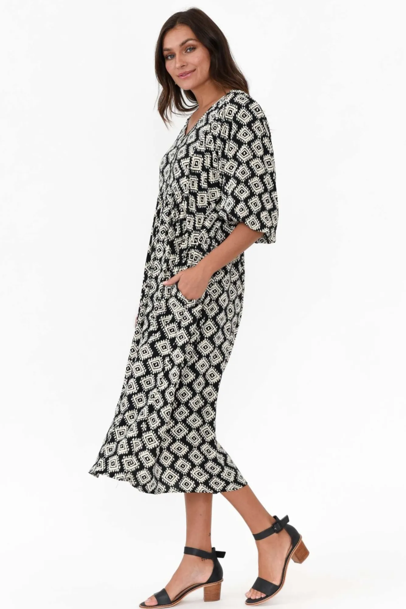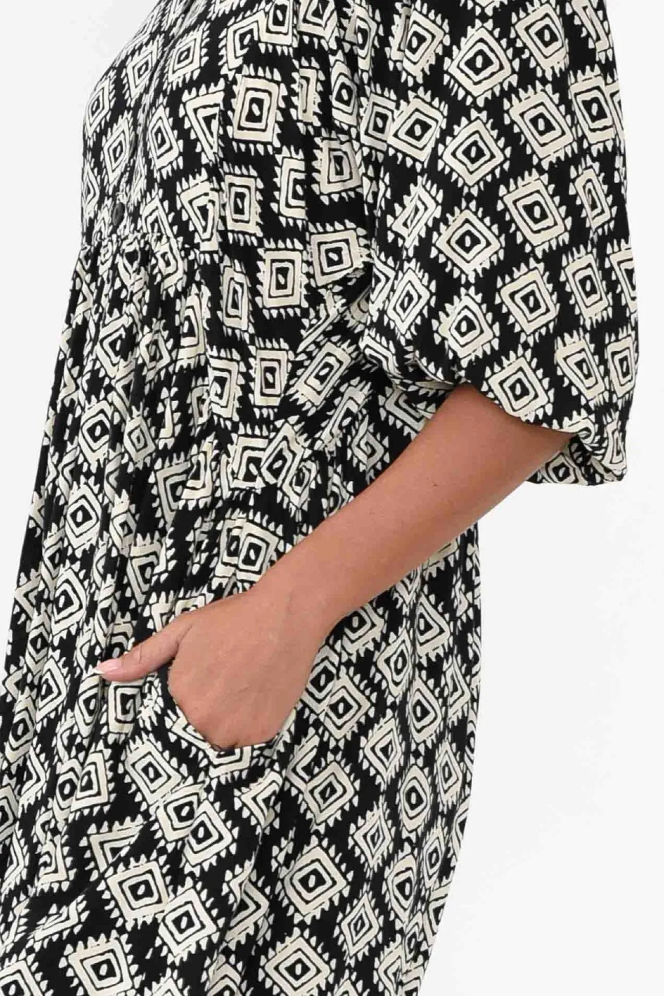 Fit: True To Size. Refer To Size & Fit Tab Below For Specific Size RecommendationNNfabric: 100% RayonNconstructed From Comfortable And Soft Non-Stretch Fabric With A Breezy, Lightweight Hand Feel Nsharp V-Neckline With Fixed Faux Button Detailing Down Bust Nhalf-Length Puff Sleeves Enhanced By Elasticated Cuff Nrelaxed Empire-Style Silhouette Elevated By Cresent Waist Seam Ntwo Discreet Side Seam Pockets NNhi-Lo Hemline Falls Below Knee Length NNNcare: Cool Gentle Hand Wash RecommendedNNcolour: Black And Cream Intricate Geometric Print