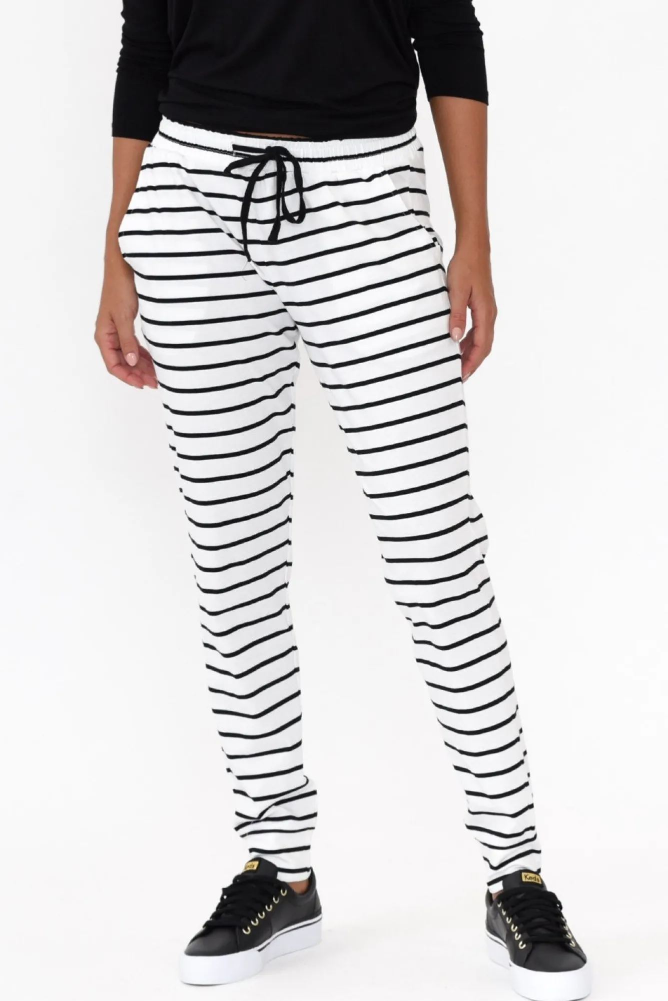 Fit: True To Size. Refer To Size & Fit Tab Below For Specific Size RecommendationNNfabric: Cotton/ElastaneNa Comfortable, Lightweight Pant With Soft, Stretch Cotton FabricNclassic Jogger Pant With Elasticised Waistband And Black Drawstring Tie For AdjustabilityNwear Mid-Rise For An Ultra-Flattering SilhouetteNNtwo Generous Pockets At The HipNfull Length DesignNNstretchy Tapered CuffsNNcare: Cool Gentle Machine Wash RecommendedNNcolour: White With Thin Black StripeNNnote: Measurements Vary Between Colours. Please Refer To Individual Product Measurements To Find Your Perfect Fit.