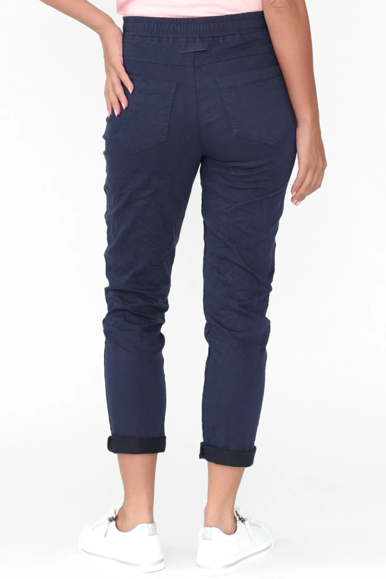 Fit: True To Size. Refer To Size & Fit Tab Below For Specific Size RecommendationNNfabric: 60% Cotton, 37% Polyester, 3% Spandex Ncrafted From Lightweight, Slightly Stretchy Cotton Blend Fabric Designed With Denim-Like Texture And A No-Fuss Crinkle FinishNwear With A Relaxed Crushed Effect Or Steam For A Sleek LookNmid-Rise Ruched Elasticated Waistband With An Adjustable Drawstring NNstraight Silhouette With A Slim-Style Fit NNfour Pocket Design – Two At The Front And Back! NNreaches Ankle Length, Can Be Cuffed For A Cropped Look NNNcare: Cool Gentle Hand Wash RecommendedNNcolour: Deep Navy