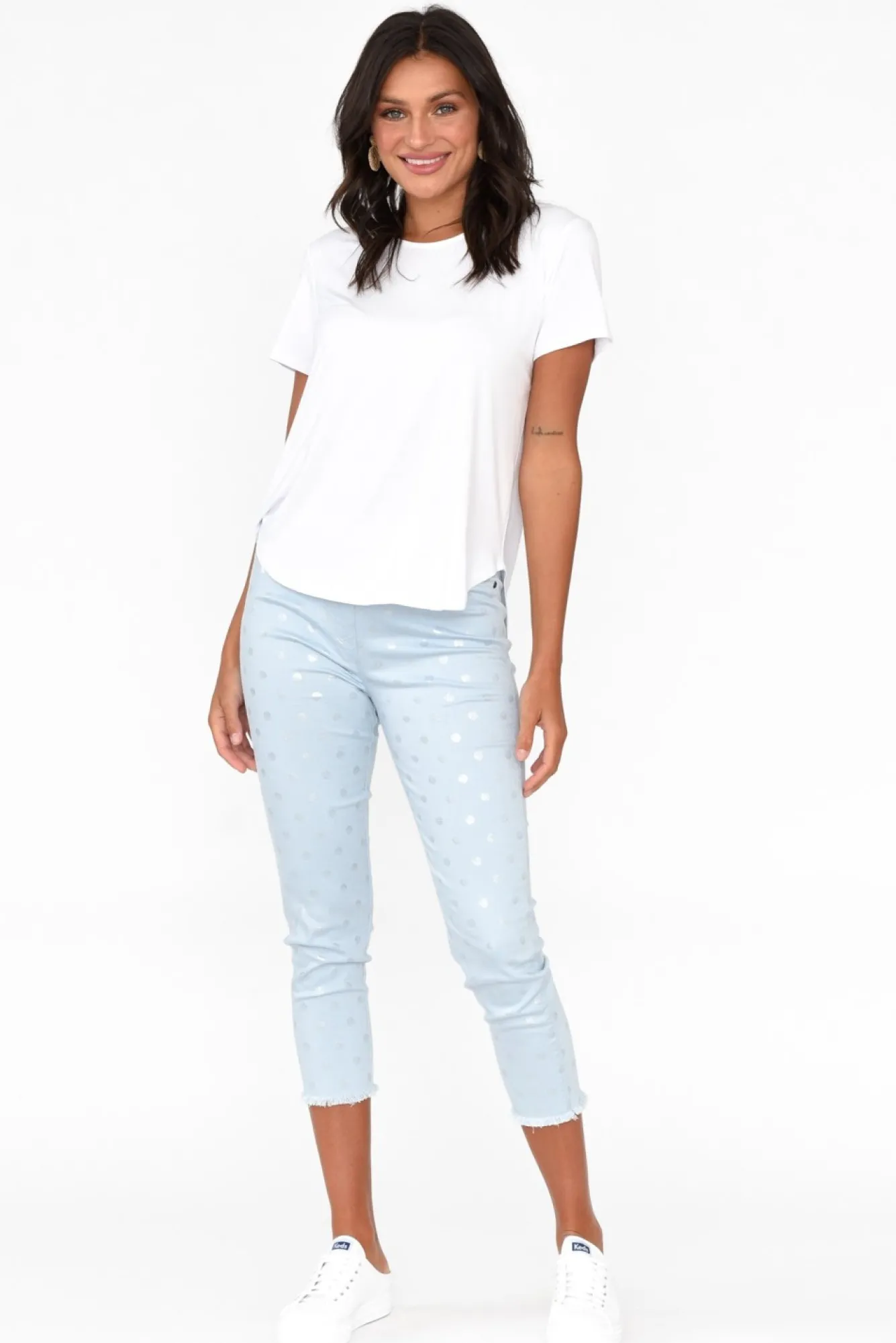 Fit: Oversized. Refer To Size & Fit Tab Below For Specific Size RecommendationNNfabric: 97% Cotton, 3% SpandexNcrafted From Midweight And Breathable Cotton With A Subtle StretchNelasticated Mid-Rise Waistband For Comfortable Fit NN4Cm Belt Loops Make It Easy To Add Your Favourite Belt Nlovely Faux Fly And Front Pocket DetailingNtwo Functional Back Pockets And Two Faux Front Pockets Nslim Leg Silhouette Reaches A Capri Length NNlightly Frayed Hem For An On-Trend LookNNcare: Cool Gentle Hand Wash RecommendedNNNcolour: Soft Powder Blue With Silver Foil Polka Dots