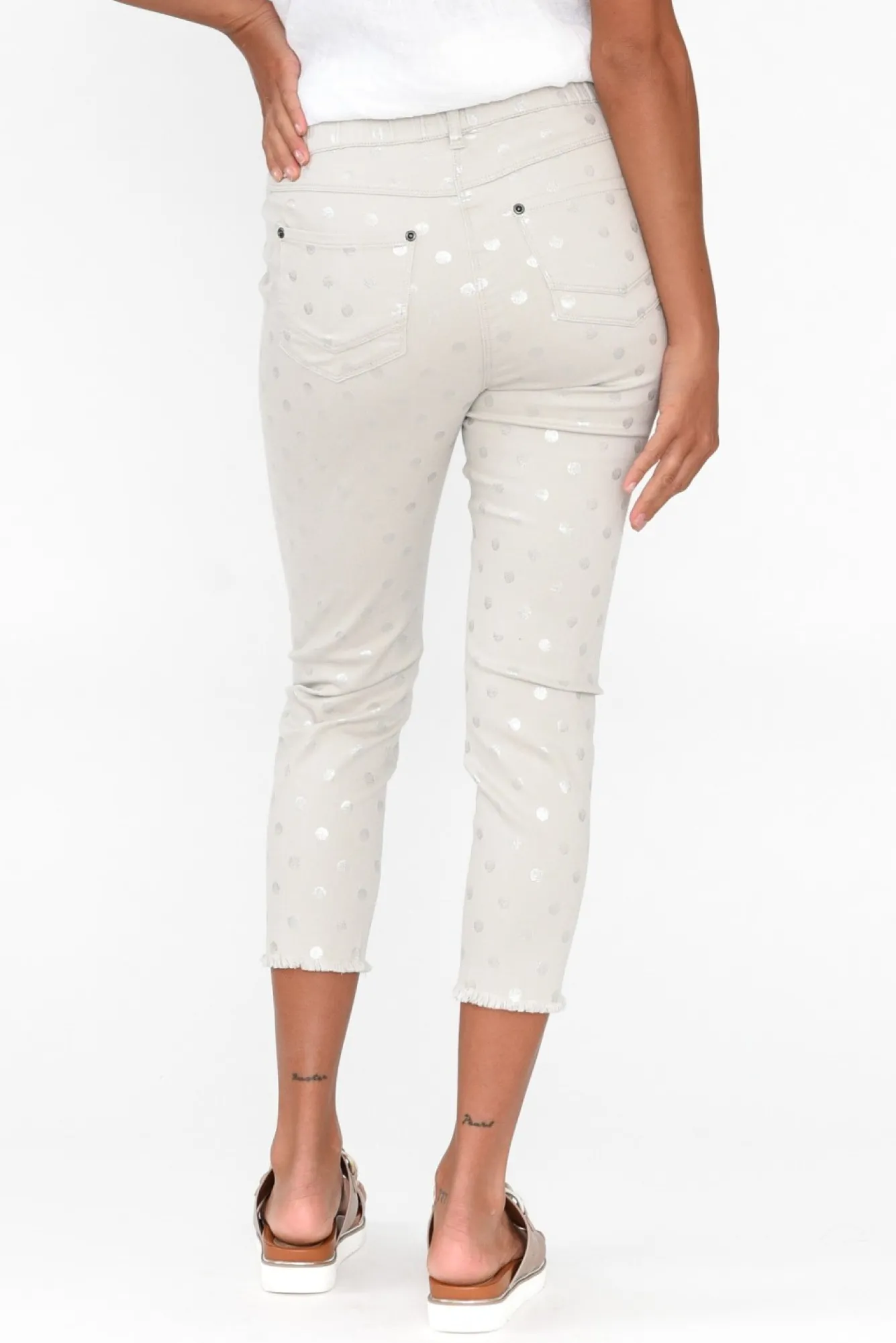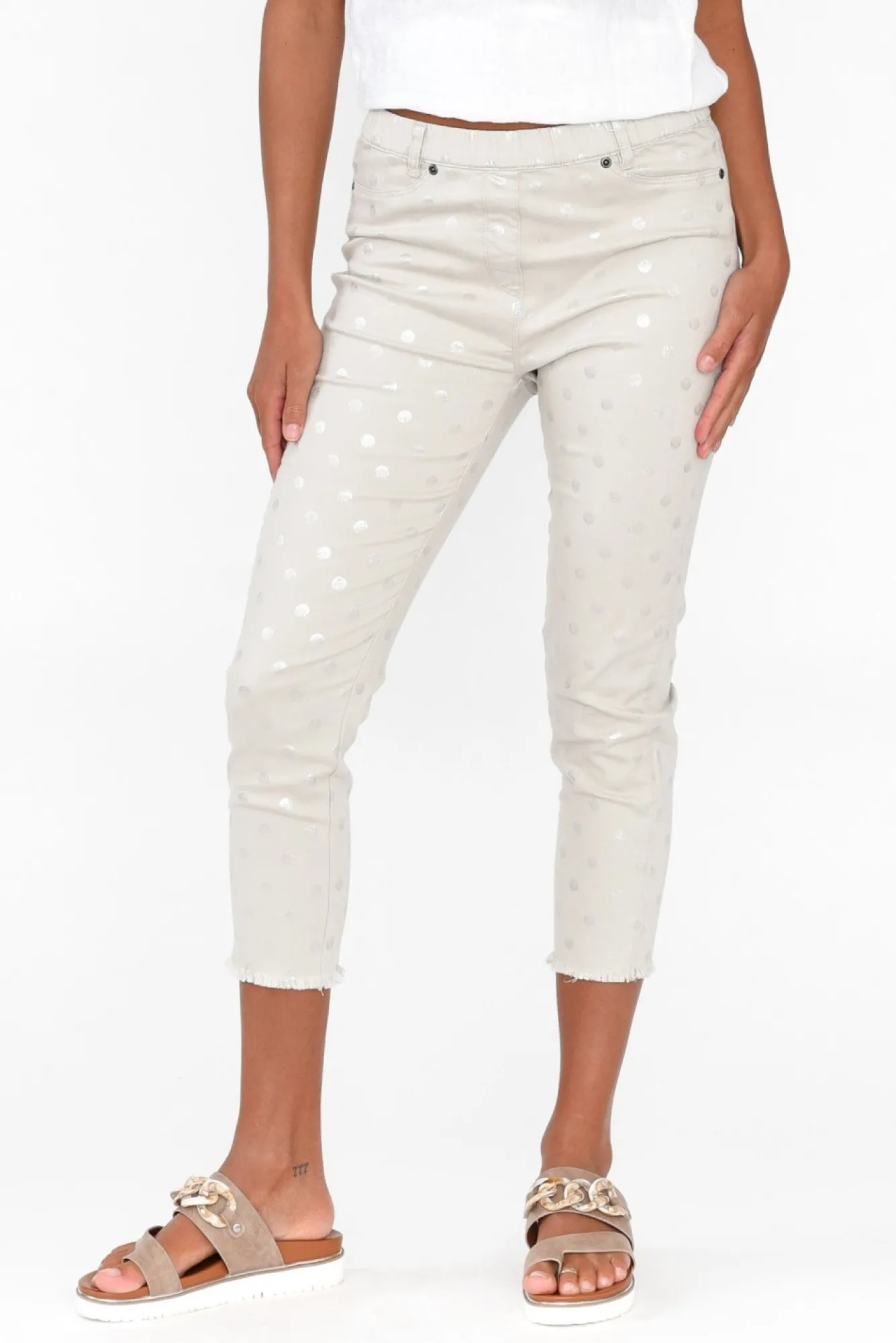 Fit: Oversized. Refer To Size & Fit Tab Below For Specific Size RecommendationNNfabric: 97% Cotton, 3% SpandexNmidweight, Breathable And Slightly Stretchy Cotton FabricNcomfortable And Classic Capri Style Pant, The Perfect Staple To Any WardrobeNflattering Mid-Rise Designed To Sit At WaistNfirm-Stretch Elasticated Waistline Offers Additional ComfortN4Cm Belt Loops, Fantastic For Adding Your Favourite BeltNlovely Faux Fly And Front Pocket DetailingNtwo Functional Back PocketsNslim Leg Fit Sits Beautifully At A Cropped Capri LengthNlightly Frayed Hem For An On-Trend LookNNcare: Cool Gentle Hand Wash RecommendedNNNcolour: Gorgeous Taupe With Silver Spot Print
