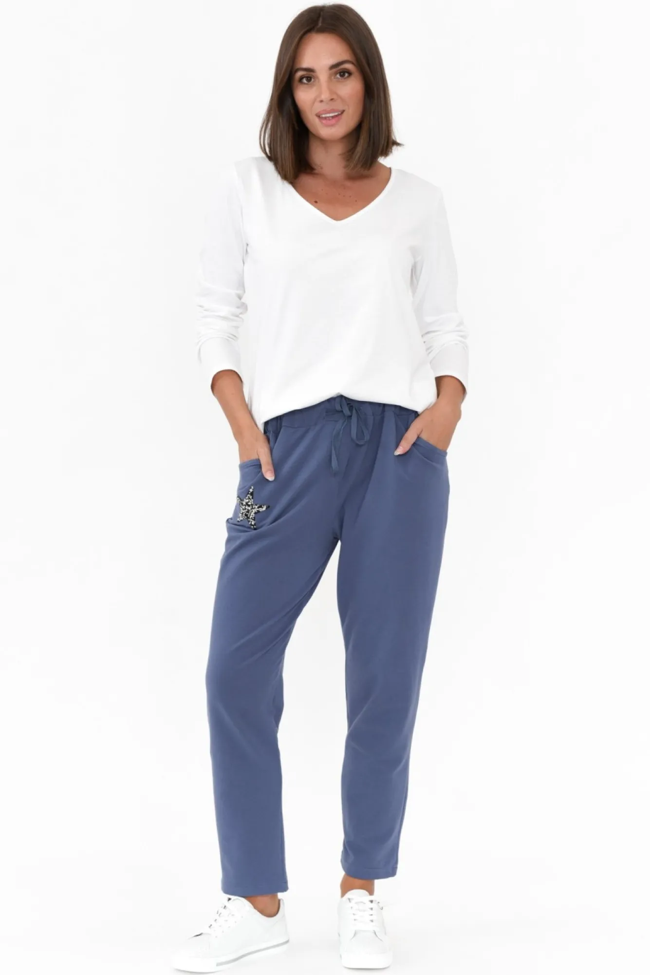 Fit: True To Size. Refer To Size & Fit Tab Below For Specific Size RecommendationNNfabric: 90% Cotton, 10% Spandex Nmidweight And Breathable Cotton Lounge Pants With A Soft And Stretchy Hand-FeelNNstretch Elastic Waistband With A Matching Blue DrawstringNfeaturing Star Embellishment With Black And Silver Diamantes Nfunctional 5-Pocket Design – Two Hip Pockets, One Coin Pocket And Two Back PocketsNcomfy Jogger Silhouette Perfect For Lounging And Staying Active! NNfull Length Style Grazes The Ankle NNNcare: Cool Gentle Hand Wash RecommendedNNcolour: Washed Dark Blue ShadeNNnote: Please See Photos Rather Than Video For Most Accurate Colour