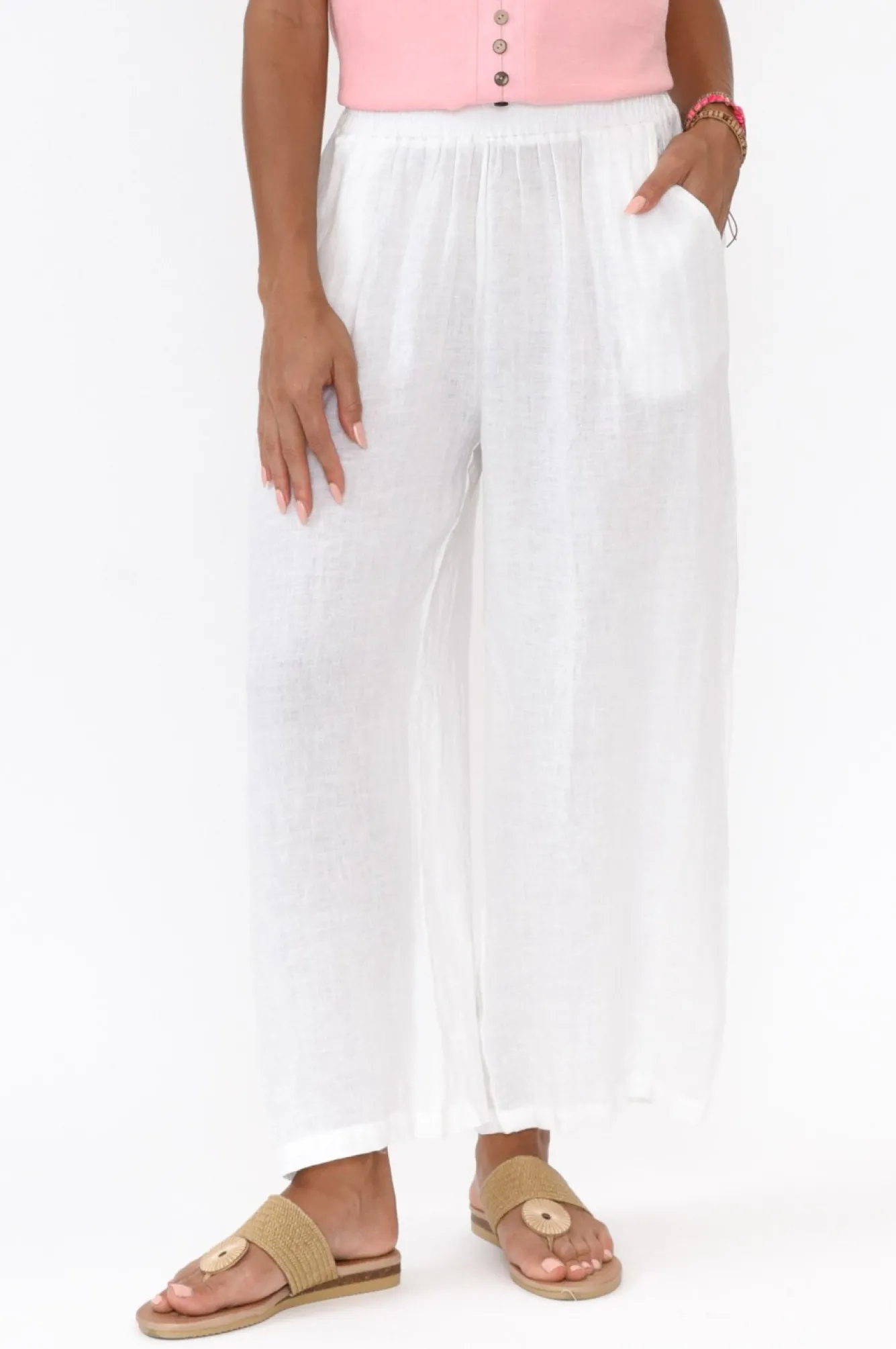 Fit: True To Size. Refer To Size & Fit Tab Below For Specific Size Recommendation NNfabric: 100% LinenNcomfortable Ultra-Lightweight, Breathable And Non-Stretch Linen With A Soft Woven FinishNNwide Elasticated Ruched WaistNflattering Wide-Leg Silhouette NNtwo Front Pockets Located Near The HipsNNstraight Hemline Falls To An Ankle-Skimming LengthNNNcare: Cool Gentle Machine Wash RecommendedNNcolour: Fresh White Hue