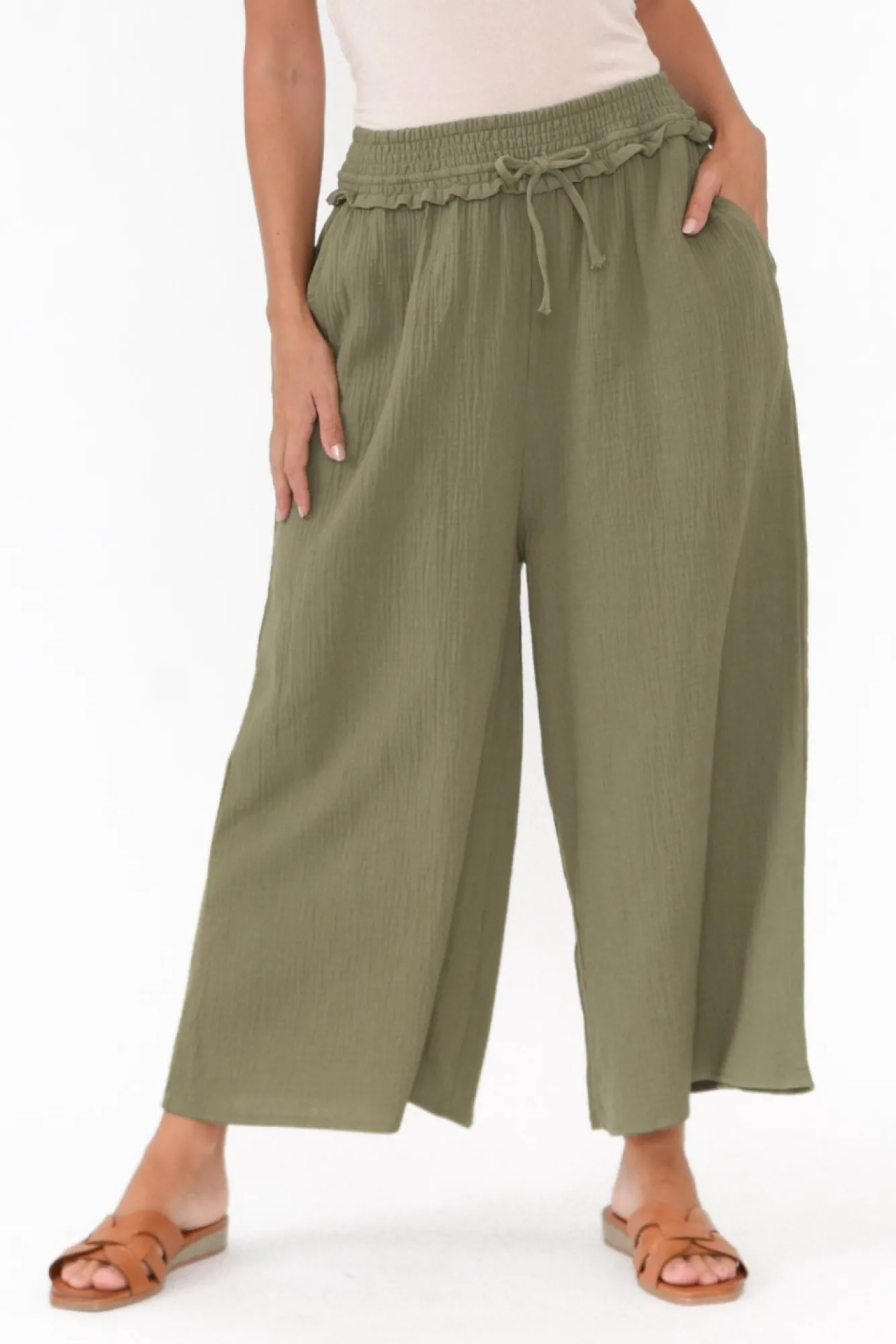 Fit: True To Size. Refer To Size & Fit Tab Below For Specific Size RecommendationNNfabric: 100% CottonNultra-Comfortable Lightweight Cotton Fabric, Offering Wonderful Breathability And A Soft Texture NNwide Ruched Elastic Waistband With An Adjustable Drawstring TieNpalazzo Style Wide Leg Silhouette Ntwo Generous Hip PocketsNNfalls To Cropped Ankle Length NNNcare: Cool Gentle Machine Wash RecommendedNNcolour: Soft Khaki Shade