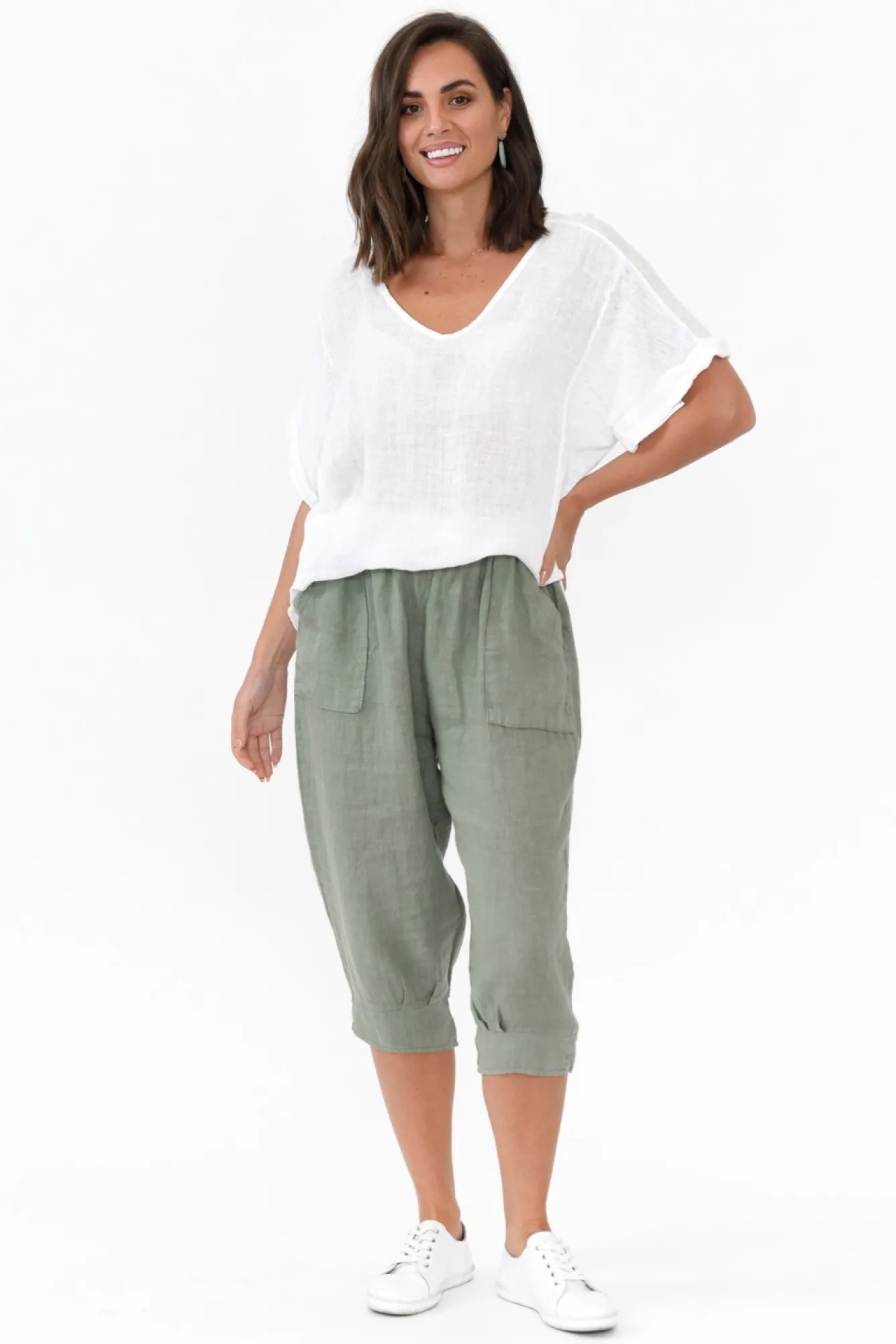 Fit: True To Size. Refer To Size & Fit Tab Below For Specific Size Recommendation NNfabric: 100% LinenNthe Perfect Summer Pant Crafted In Italy From Lightweight, Breathable And Non-Stretch Linen With A Soft Woven FeelNNruched Elastic Waist For Comfort Nstraight-Leg Style With Subtle Tapering Near The Hem NNtwo Large Front Pockets NNcapri Length Perfect For Shorter LegsNNcare: Cool Gentle Hand Wash RecommendedNNNcolour: Light Khaki Green
