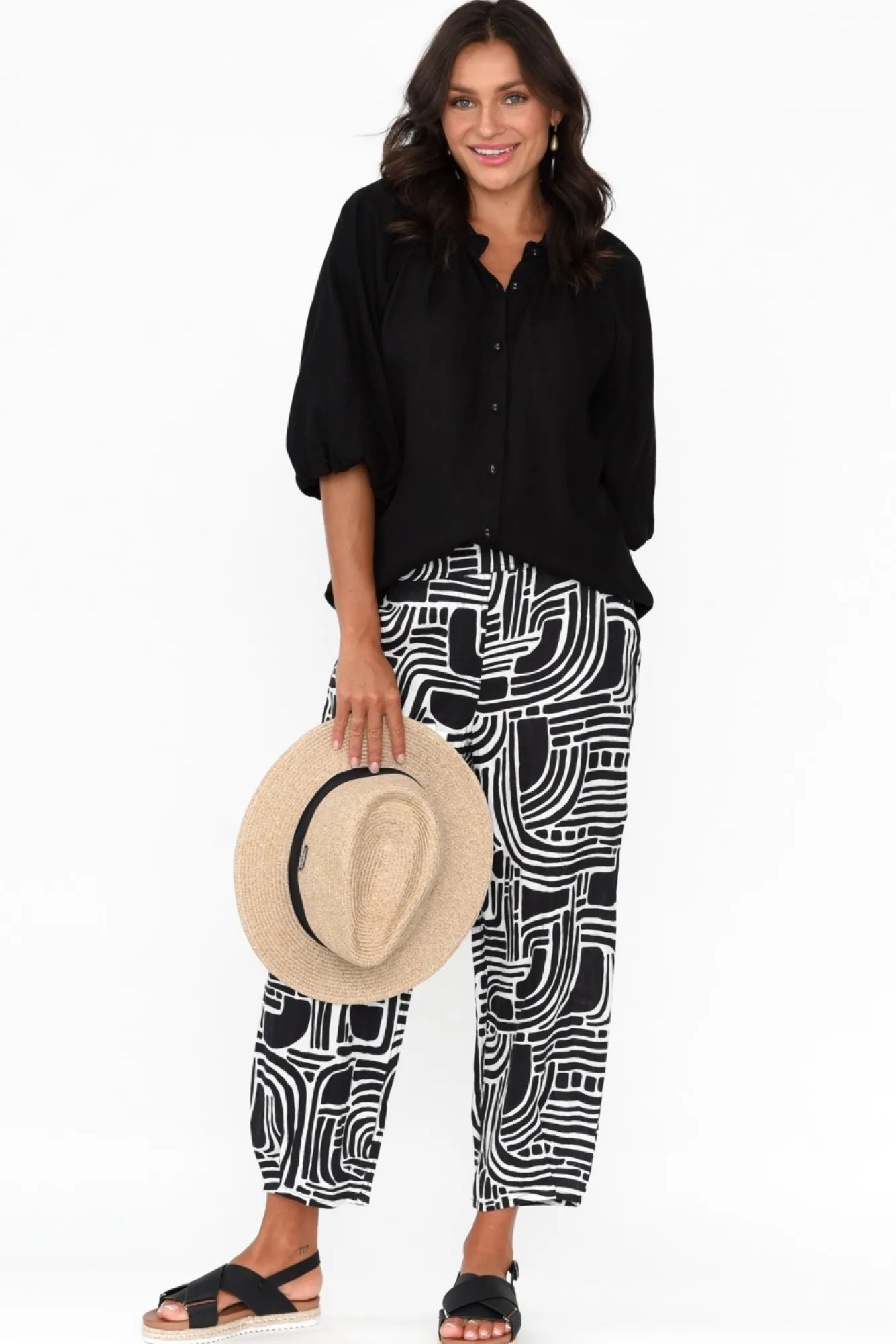 Fit: True To Size. Refer To Size & Fit Tab Below For Specific Size RecommendationNNfabric: 100% LinenNcrafted From Luxurious Lightweight, Breathable And Non-Stretch Line With A Signature Woven Hand Feel NNflat Waistband With A Ruched Elasticated Back NNbreezy Straight Silhouette Tapers At The HemNNthree Pocket Design – Two At The Hips And One At The Back NNtapered Hem Reaches A Crop Length NNNcare: Cool Gentle Machine Wash RecommendedNNcolour: Black White Soft Geo Print