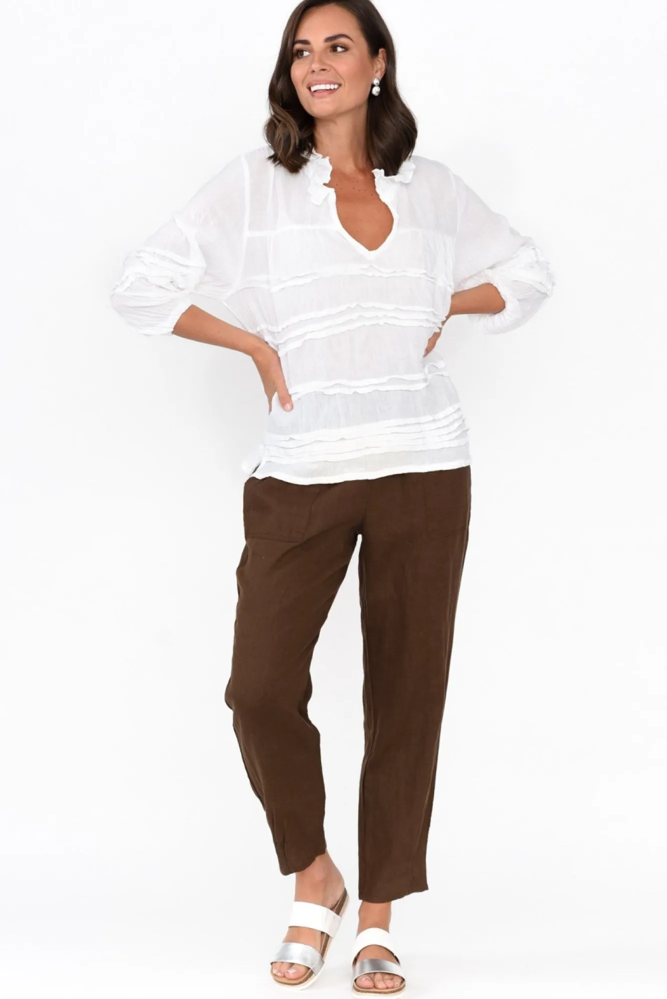 Fit: True To Size. Refer To Size & Fit Tab Below For Specific Size RecommendationNNfabric: Main: 100% Linen Waistband: 95% Cotton, 5% ElastaneNultra-Lightweight, Breathable And Non-Stretch Linen Designed With A Signature Soft Woven Hand Feel NNsupportive Mid-Rise Elasticated Waistband With A Soft Jersey-Style Finish NNrelaxed Straight-Leg Design With Subtle Tapering Towards The Hem NNtwo Exposed Front Pockets Defined By Stitching Detail Nstraight Hem Reaches Ankle Length And Features Delicate Pleating Detail NNcare: Cool Gentle Hand Wash RecommendedNNcolour: Warm Chocolate Brown Hue