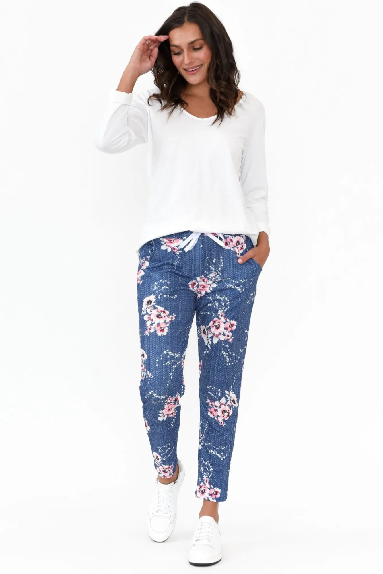 Fit: True To Size. Refer To Size & Fit Tab Below For Specific Size RecommendationNNfabric: 65% Polyester, 35% Cotton Ncomfortable Lightweight Fabric With An External Soft Hand Feel And Lined With A Loopback Finish Creating A Subtle Stretch Nelasticated Waistband With Adjustable Drawstring NNstraight Jogger-Style Silhouette NNtwo Handy Hip Pockets NNfalls Just Above The Ankle Length NNcare: Cool Gentle Hand Wash RecommendedNNcolour: Deep Blue And White Fleck Base With A Delicate Pink Floral Print