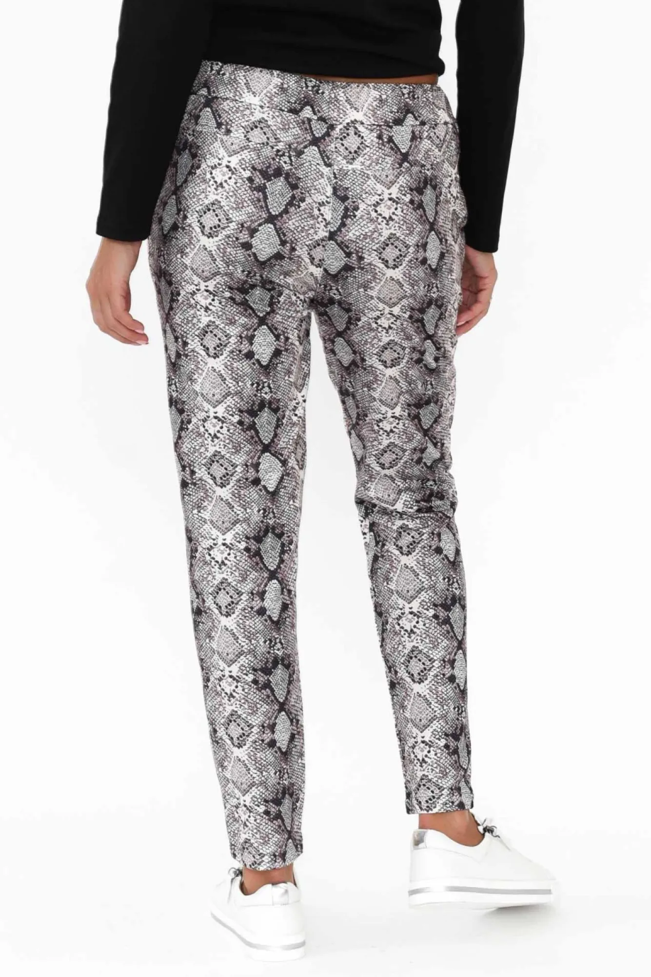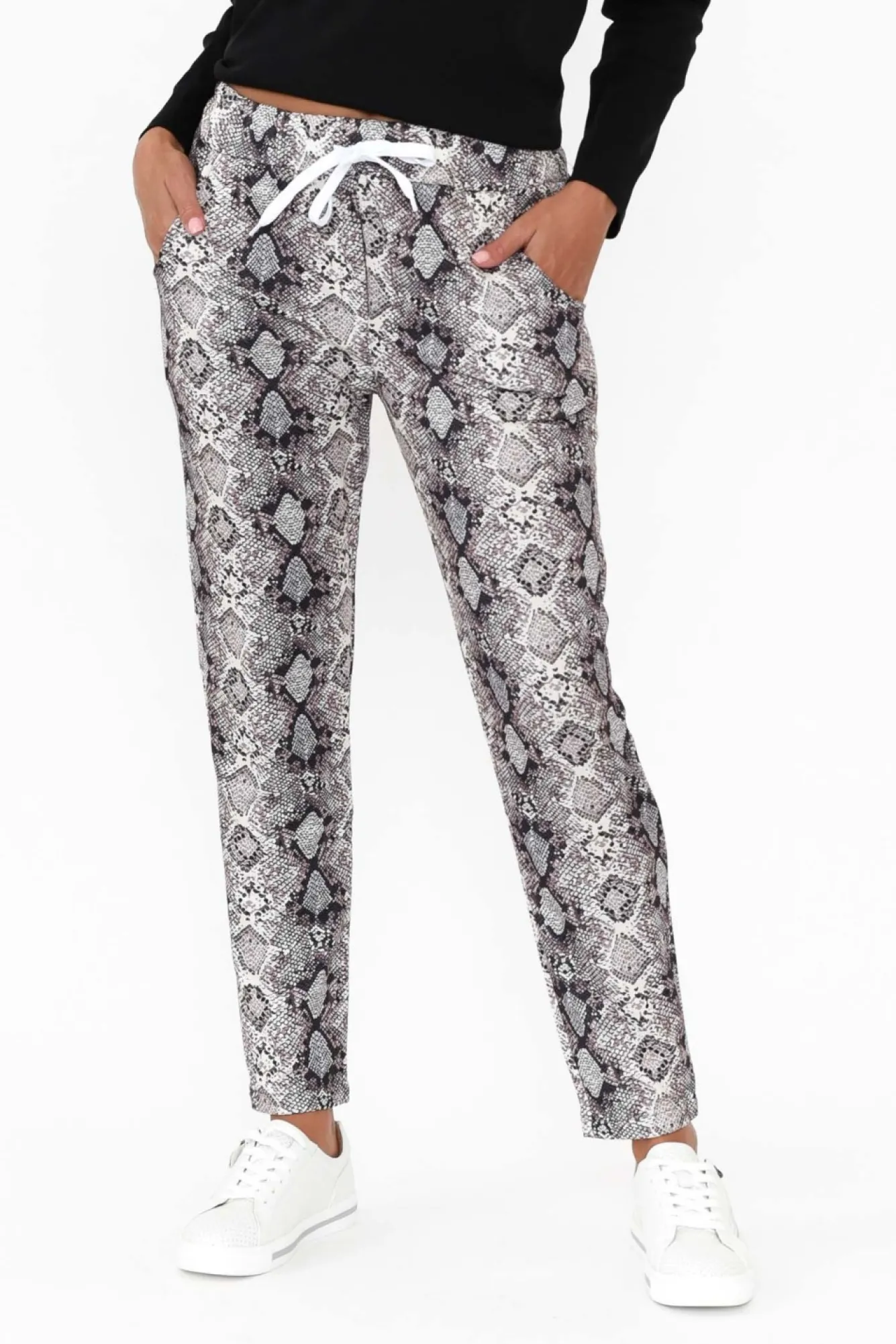 Fit: True To Size. Refer To Size & Fit Tab Below For Specific Size RecommendationNNfabric: 65% Polyester, 35% Cotton Nconstructed From Lightweight Fabric With An External Soft Hand Feel And Lined With A Loopback Finish Creating A Subtle Stretch Nultra-Comfortable Elasticated Waistband Complete With Adjustable Drawstring NNeveryday Straight Jogger-Inspired Silhouette NNpractical Design Enhanced By Two Hip Pockets NNreaches Just Above The Ankle NNNcare: Cool Gentle Hand Wash RecommendedNNcolour: Cream, Grey And Brown Intricate Snakeskin Print