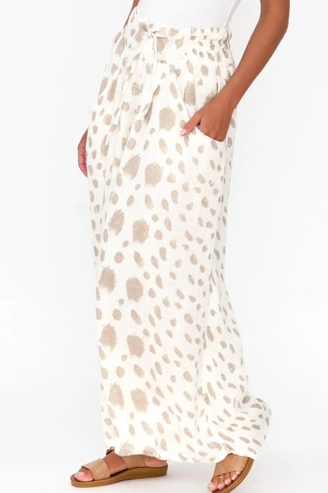 Fit: True To Size. Refer To Size & Fit Tab Below For Specific Size RecommendationNNfabric: 100% LinenNluxurious Breathable And Non-Stretch Linen Designed With A Loose Woven Hand Feel NNfully Lined Through The Leg Nwide Mid-Rise Waistband With A Drawstring Front And Ruched Elasticated Back NNfloaty Wide-Leg Silhouette Creates A Dramatic Look NNtwo Front Pockets With A Slouchy Finish NNstraight Hemline Falls To Ankle Length NNNcare: Cool Gentle Hand Wash RecommendedNNcolour: Fresh White Base With A Beige Abstract Spot Print