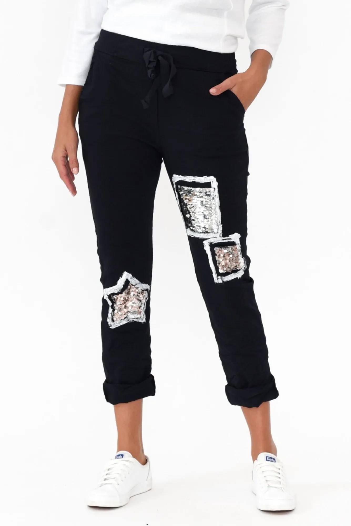 Fit: True To Size. Refer To Size & Fit Tab Below For Specific Size RecommendationNNfabric: 65% Viscose 30% Nylon 5% Elastane Ncomfortable Lightweight And Stretchy Fabric With A Smooth Hand Feel NNmade In ItalyNelasticated Waist With Adjustable DrawstringNstraight Silhouette Tapers At The Hem – Can Be Cuffed For A Cropped Casual Look!NNjogger Design Enhanced By Faux Fly DetailNtwo Handy Hip Pockets NNstraight Hem Reaches Ankle Length NNNcare: Cool Gentle Machine Wash RecommendedNNcolour: Deep Navy With Silver And Gold Sequin Patches Outlined By Paint Detail