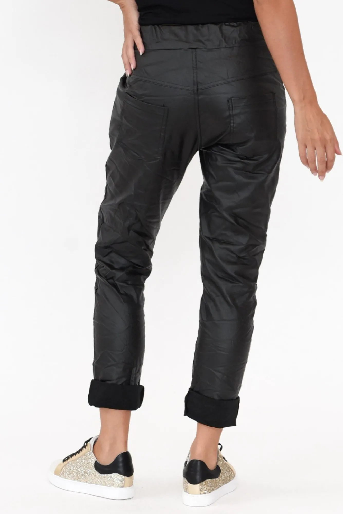 Fit: True To Size. Refer To Size & Fit Tab Below For Specific Size RecommendationNNfabric: 76% Viscose, 21% Polyester, 3% ElastaneNmade In Italy From Lightweight, Stretchy Fabric With A Crushed Wet Look Finish NNelasticated Waistband With Adjustable Drawstring NNclassic Straight-Leg Silhouette Elevated By Wet Look Design NNfour Functional Pockets – Two At The Front And Two At The Back Nhem Reaches Ankle Length – Can Be Rolled Up For A Casual Look!NNNcare: Cool Gentle Hand Wash RecommendedNNcolour: Timeless Black