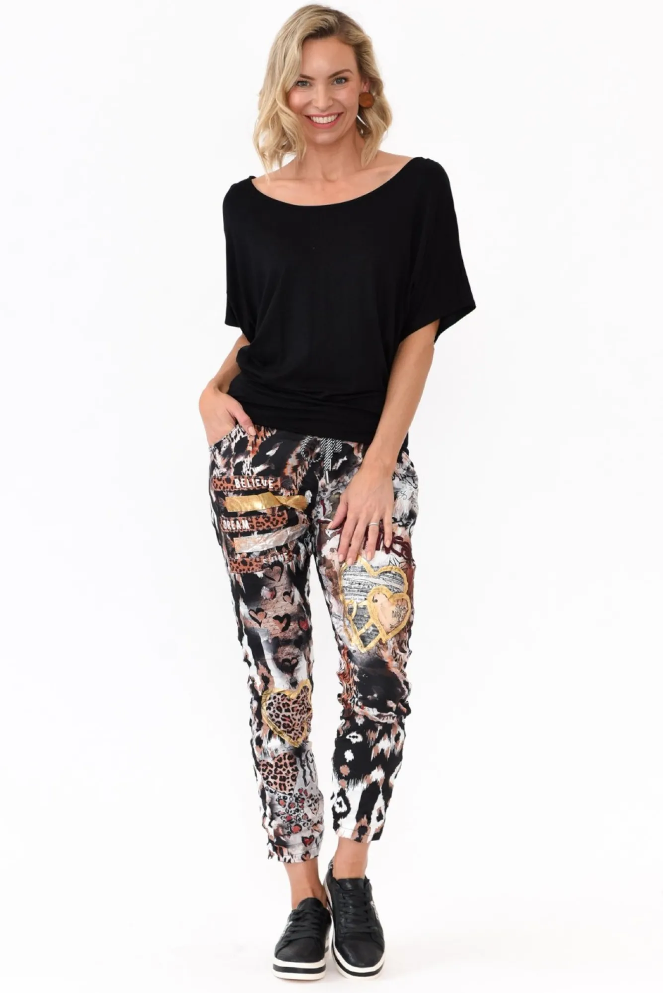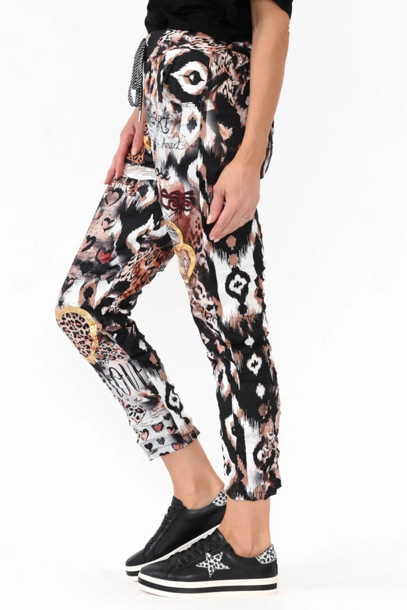 Fit: True To Size. Refer To Size & Fit Tab Below For Specific Size RecommendationNNfabric: 60% Viscose, 40% PolyesterNcrafted In Italy From Fuss-Free Crinkle Fabric With A Comfortable StretchNstretch Waist With DrawstringNelasticated Waistband Featuring Striped Metallic Drawstring TieNNeasy-To-Wear Straight Silhouette Tapers At The Hem – Wear Cuffed For A Casual Look!Nfaux Fly Detail Complemented By Two Functional Front Pockets Nreaches Above Ankle Length NNcare: Cool Gentle Hand Wash RecommendedNNcolour: Animal Print Overlayed With Stunning Graphics And Metallic Detailing