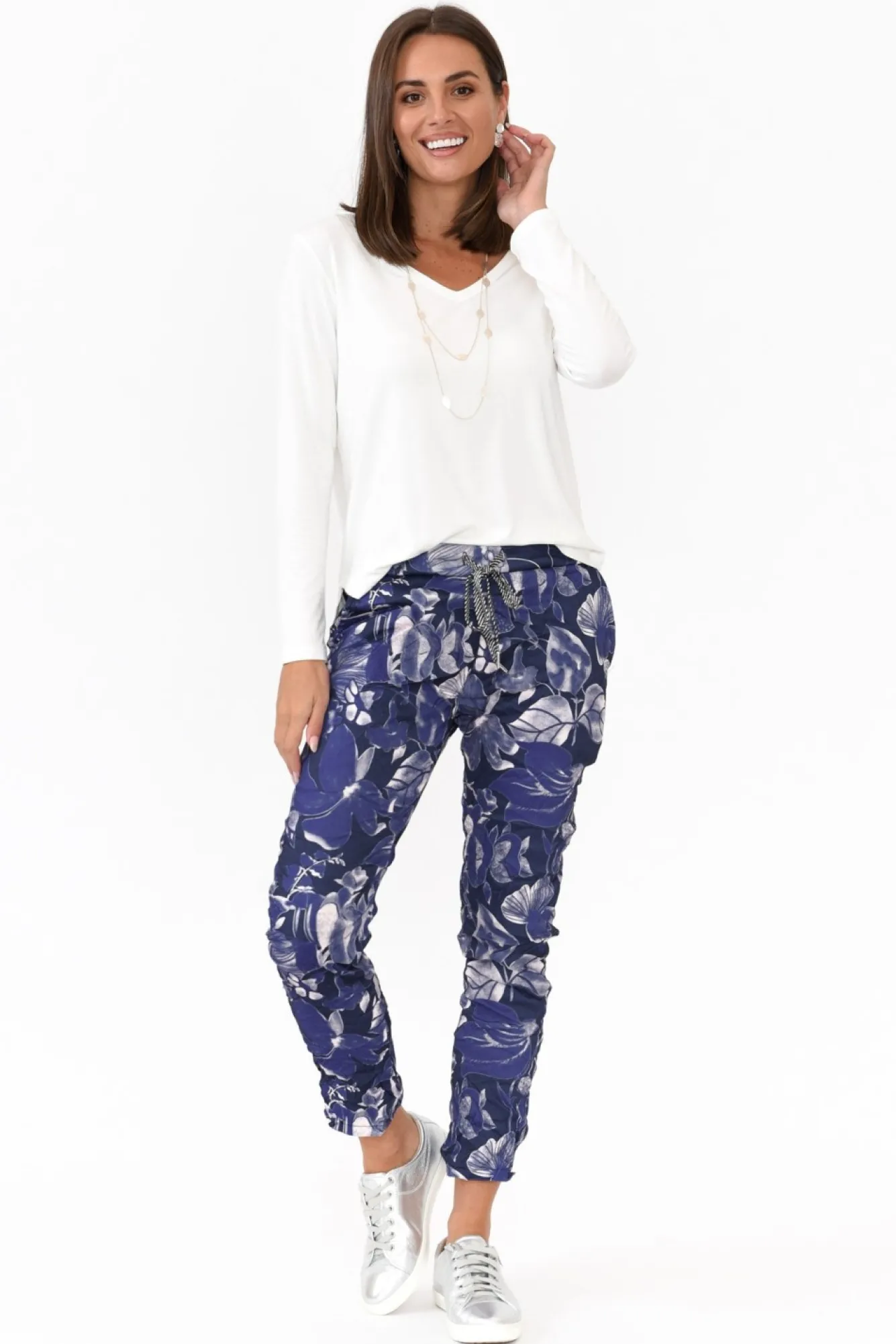 Fit: True To Size. Refer To Size & Fit Tab Below For Specific Size RecommendationNNfabric: 60% Viscose, 40% PolyesterNcrafted In Italy From Stretchy, Lightweight Fabric Designed With A Fuss-Free Crushed Crinkle Texture Nultra-Comfortable Elasticated Waistband With Adjustable Metallic Stripe Drawstring NNstraight Silhouette With A Subtle Tapered Hem – Wear Cuffed For A Casual Look!Neveryday Look Enhanced By Faux Fly Detail NNtwo Functional Pockets Located At The Hips NNNcare: Cool Gentle Hand Wash RecommendedNNcolour: Deep Navy Base With A Blue Abstract Style Floral Print