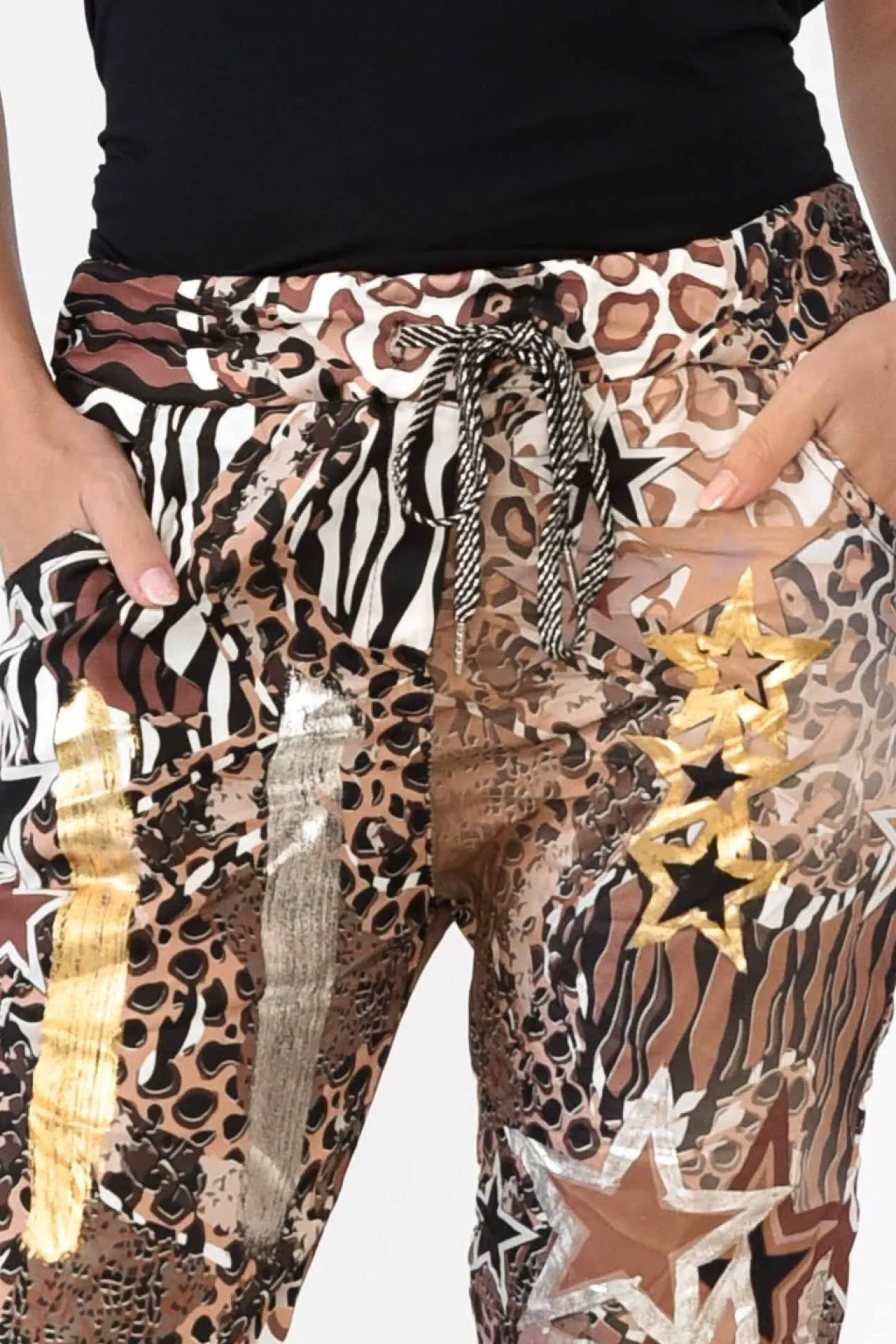 Fit: True To Size. Refer To Size & Fit Tab Below For Specific Size RecommendationNNfabric: 60% Viscose, 40% PolyesterNultra-Lightweight Fabric With Subtle Stretch And Unique Crushed Crinkle Texture Ncomfortable Elasticated Waist With An Adjustable Drawstring Nstraight Silhouette With A Subtle Tapered Hem – Wear Cuffed For A Casual Look!Nfeaturing Faux Fly And Two Functional Front Pockets Nreaches Easy-To-Wear Crop Length NNcare: Cool Gentle Hand Wash RecommendedNNcolour: Eye-Catching Brown Abstract Animal And Star Print With Metallic Details