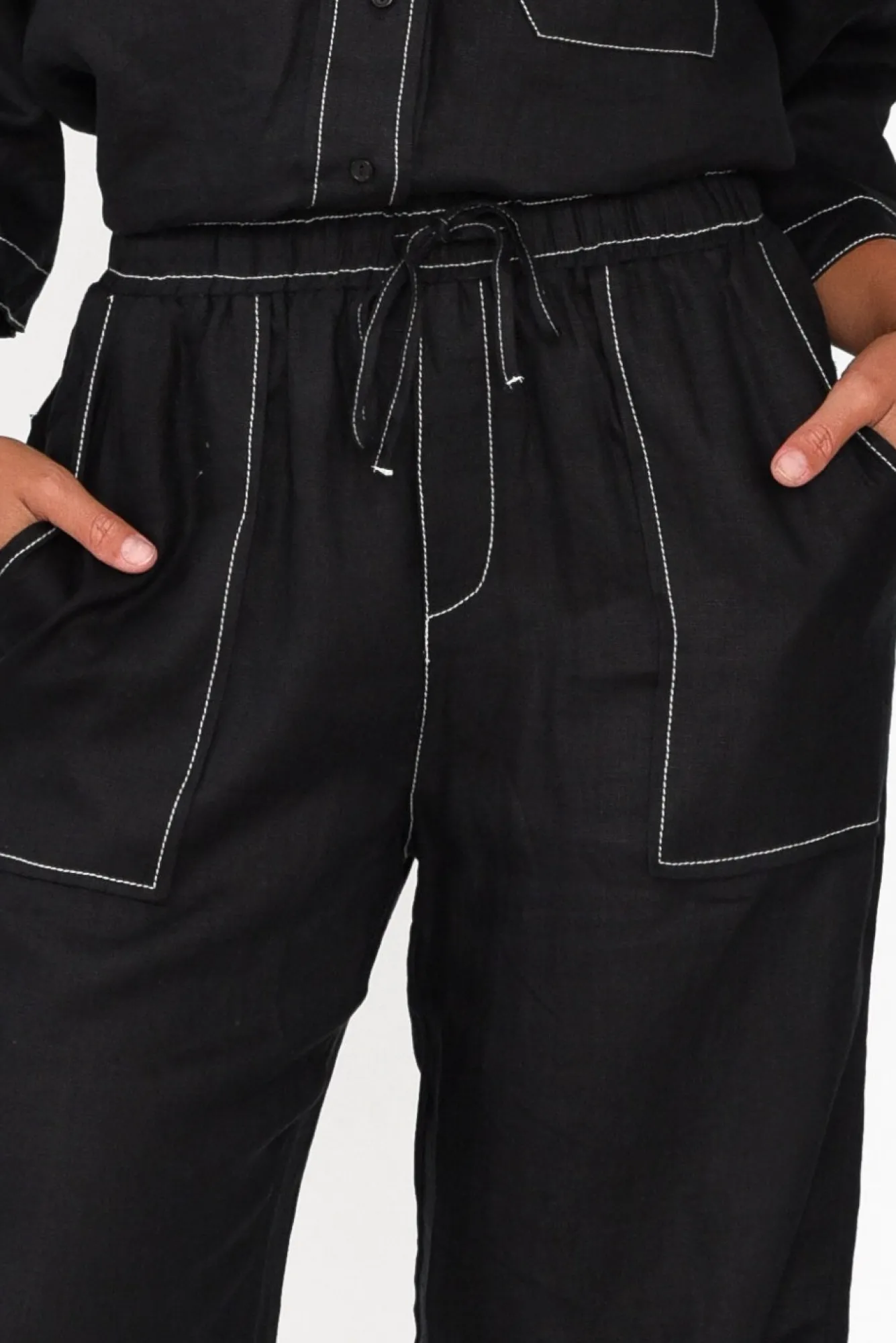 Fit: True To Size. Refer To Size & Fit Tab Below For Specific Size RecommendationNNfabric: 100% LinenNlovely Lightweight And Naturally Breathable Linen With A Structured, Woven Hand FeelNwide, Stretch Waistline With A Drawstring Detail For A Comfortable FitNNcontrast Stitching Throughout The Garment Gives This Style A Unique EdgeNwide Leg SilhouetteNNfaux Fly Detail Nfour Pockets – Two At The Front, Two At The BackNfull-Length Falls Past The Ankles NNcare: Cool Gentle Hand Wash RecommendedNNcolour: Black With White Contrast Stitching
