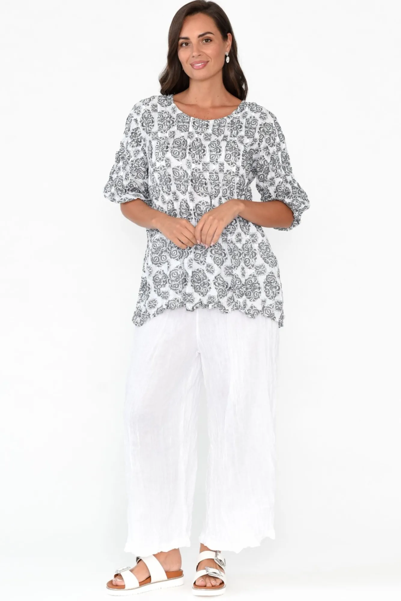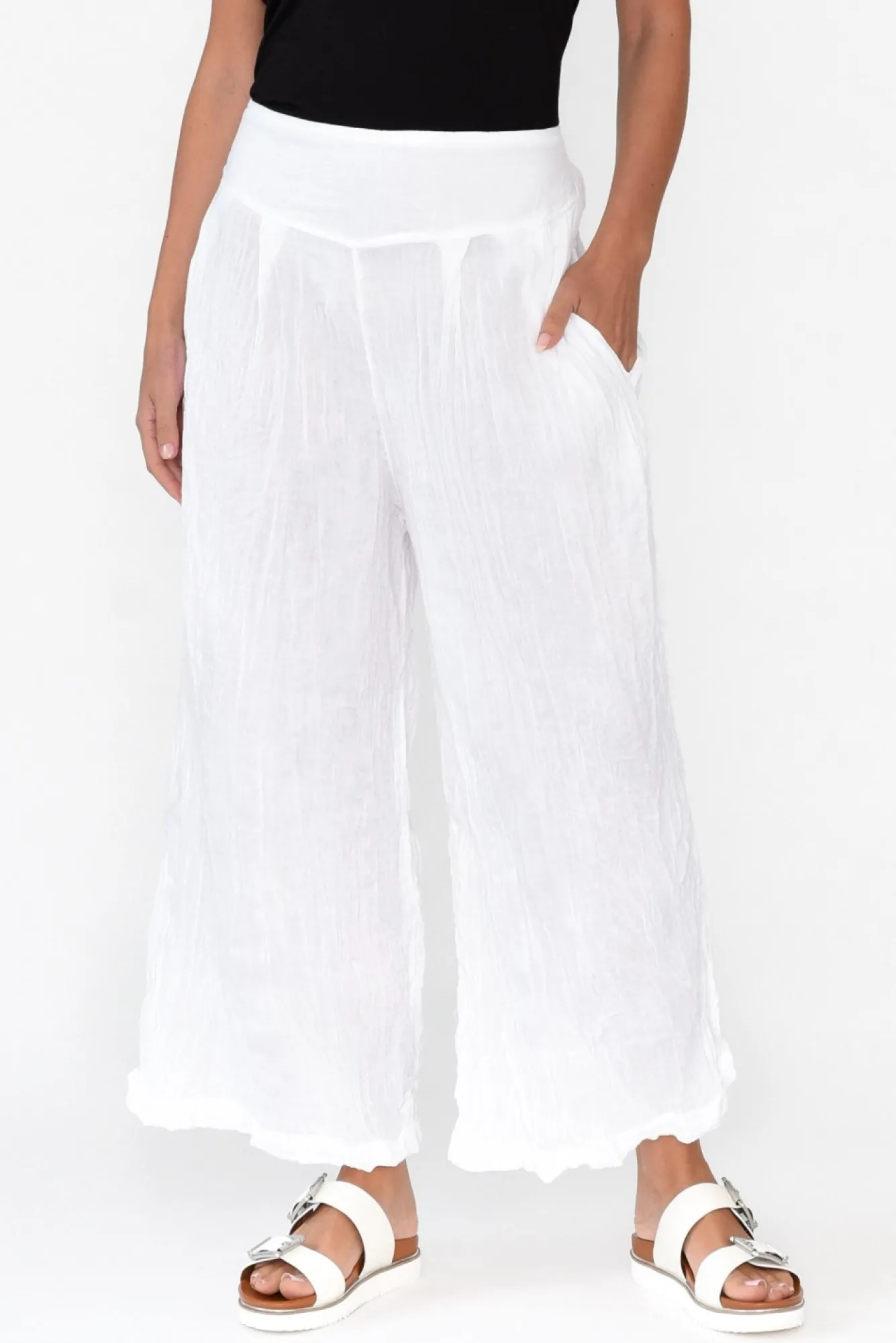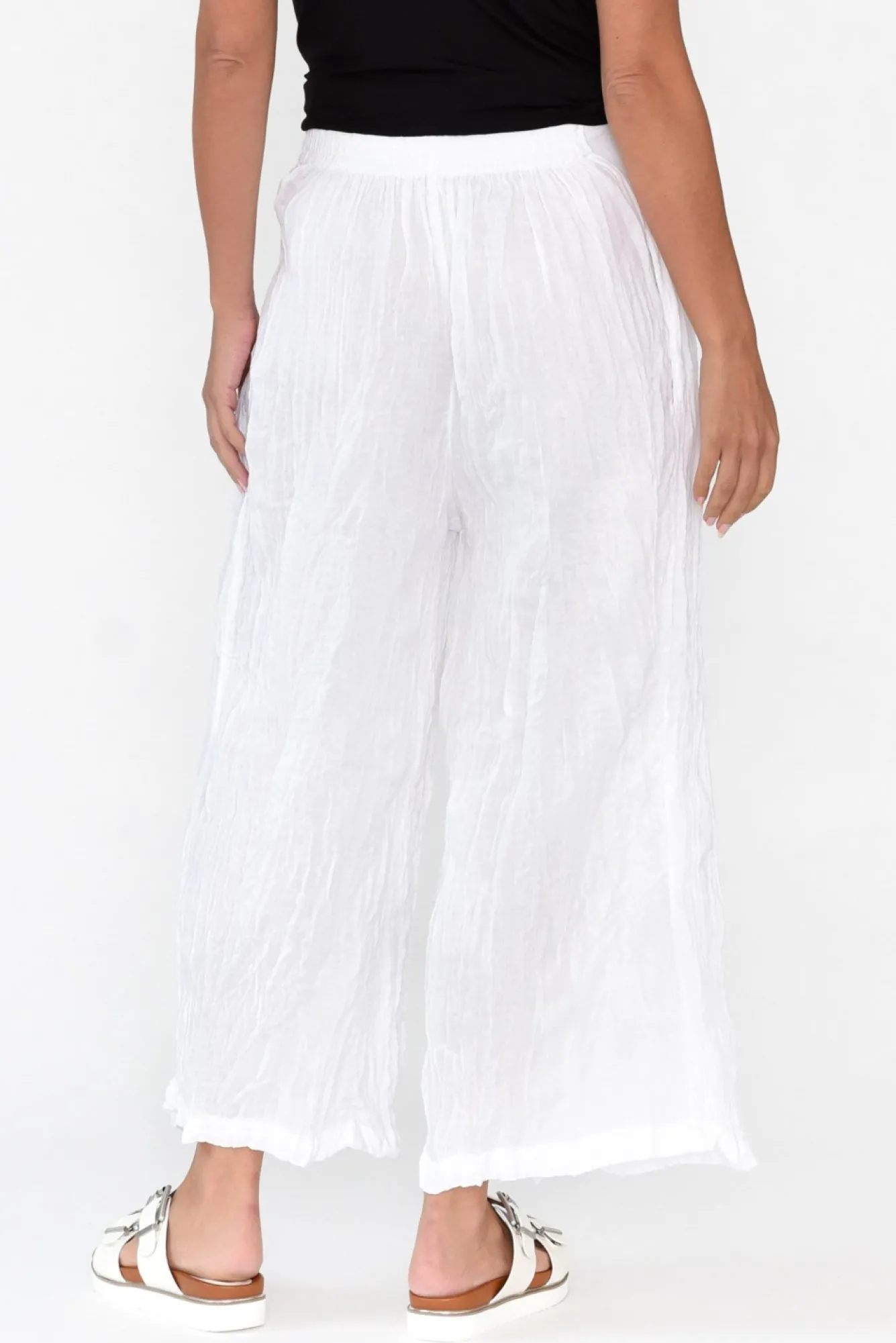 Fit: True To Size. Refer To Size & Fit Tab Below For Specific Size RecommendationNNfabric: 100% CottonNcustomer-Favourite Crinkle Cotton With Ultra-Lightweight And Naturally Breathable Qualities And A Non-Stretch, Woven Finish NNwide Waistband With A Sleek Non-Stretch Front And An Elastic Band At The BackNNtwo Discreet Hip PocketsNwide-Leg Style Flatters Shorter LegsNNfalls To Just Above The Ankle NNNcare: Cool Gentle Hand Wash RecommendedNNcolour: Classic White NNfabric Tip: Twist The Garment, Fold In Half And Secure With A Rubber Band To Store After Washing And Drying To Keep The Crinkle Alive